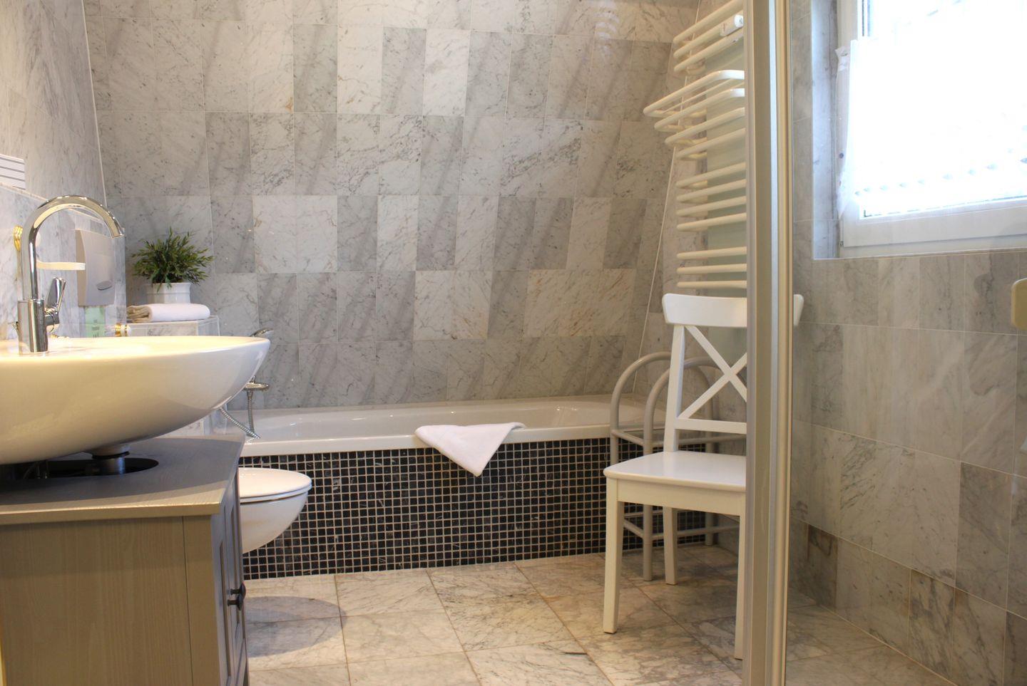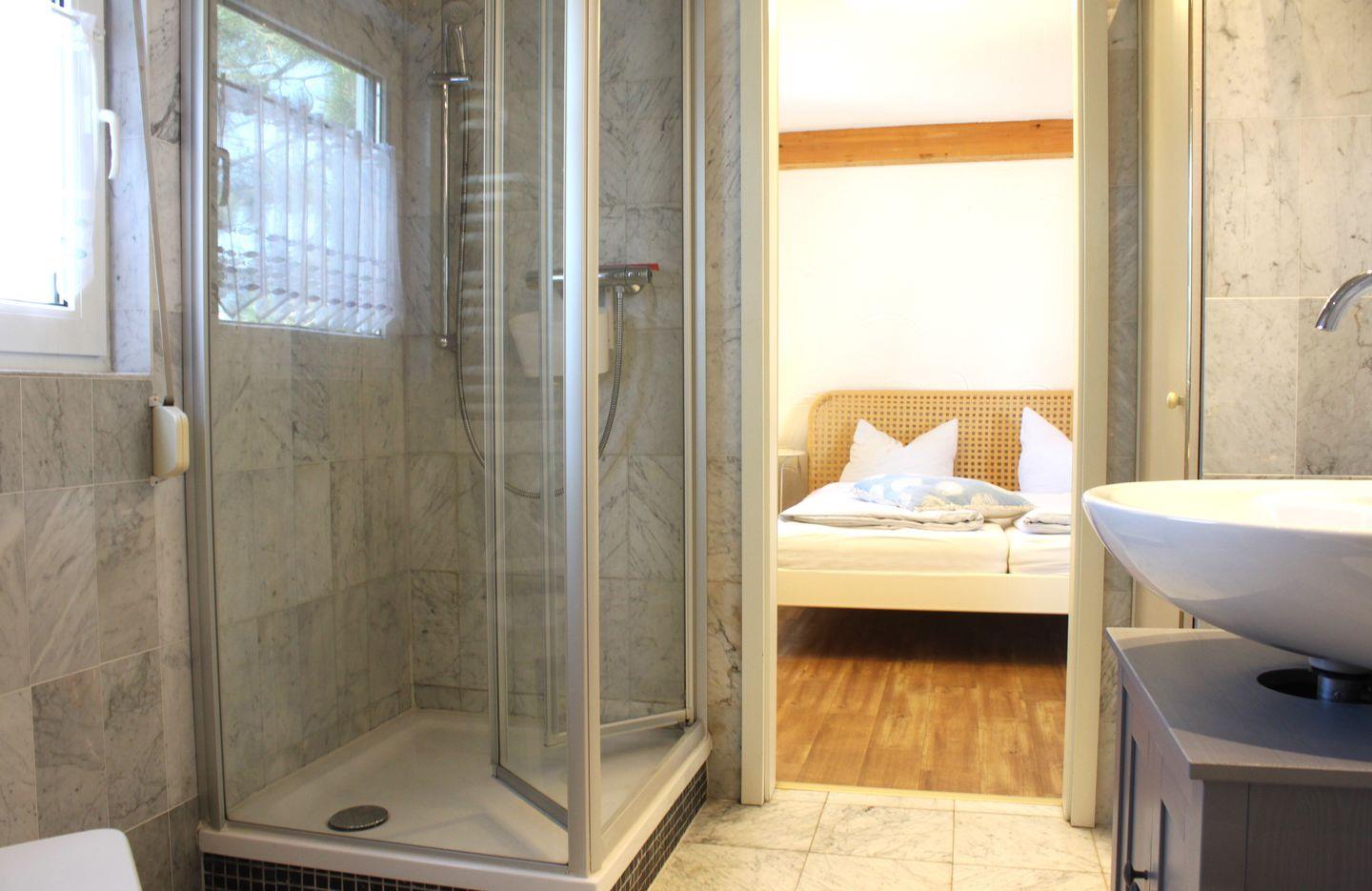Das Schlafzimmer ist mit einem komfortablem Doppelbett ausgestattet und das angrenzende Badezimmer verfügt über eine Badewanne, Dusche, Waschtisch, WC und einen Handtuchheizkörper.