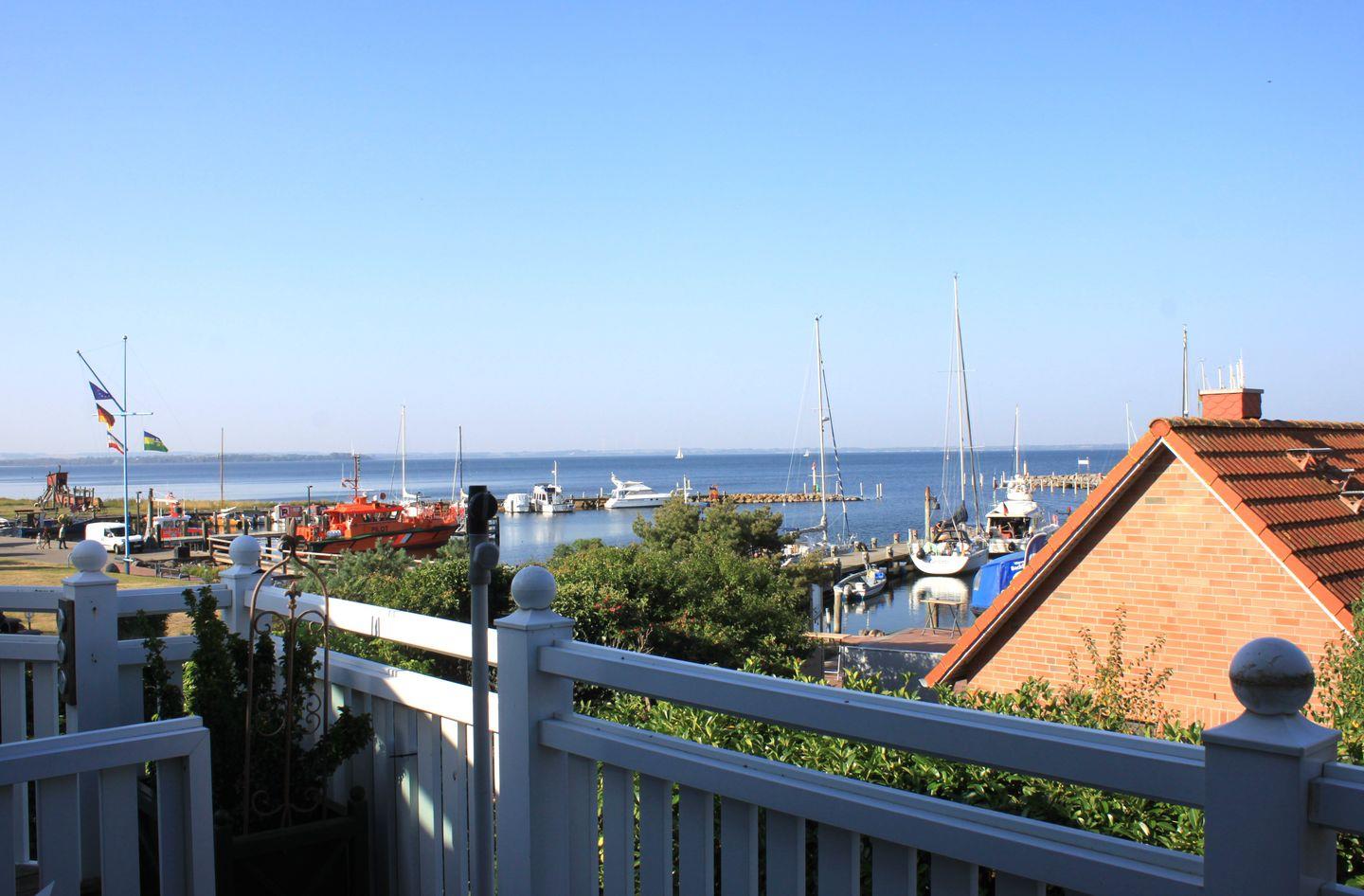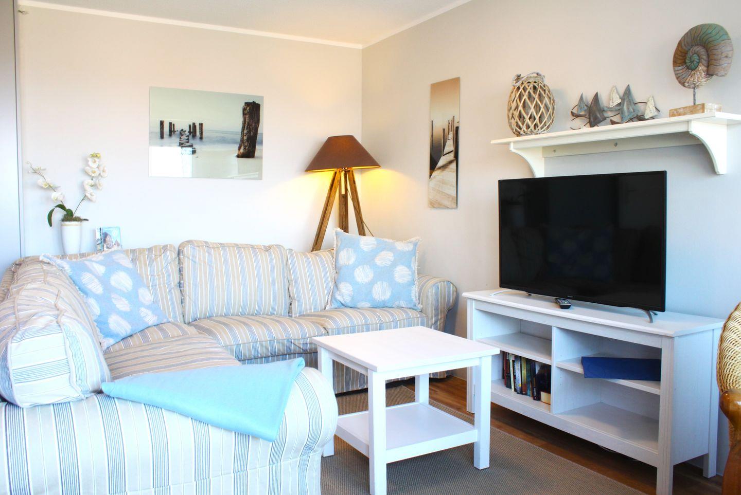 Ein heller Wohn- und Essbereich mit gemütlicher Sofaecke, TV-Gerät, Wlan und Esstisch lädt zu entspannten Stunden ein. Hier befindet sich auch der Zugang zum möblierten Balkon, von dem aus Sie einen traumhaften Blick auf die Ostsee und den Hafen von Timmendorf haben.