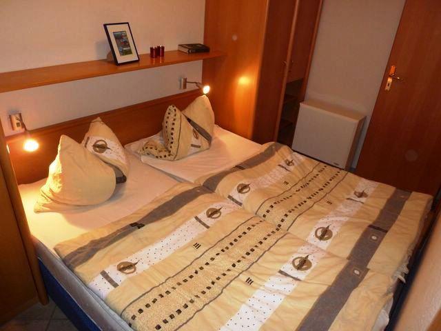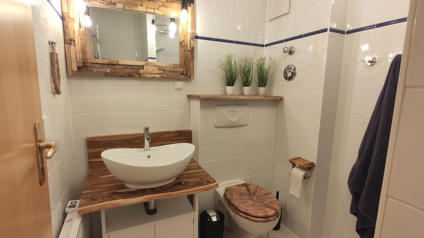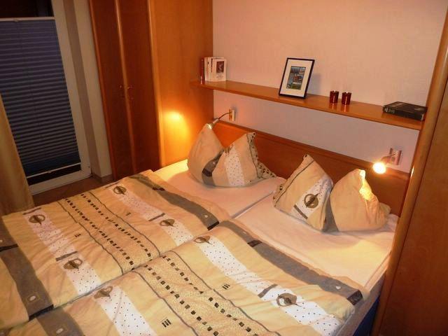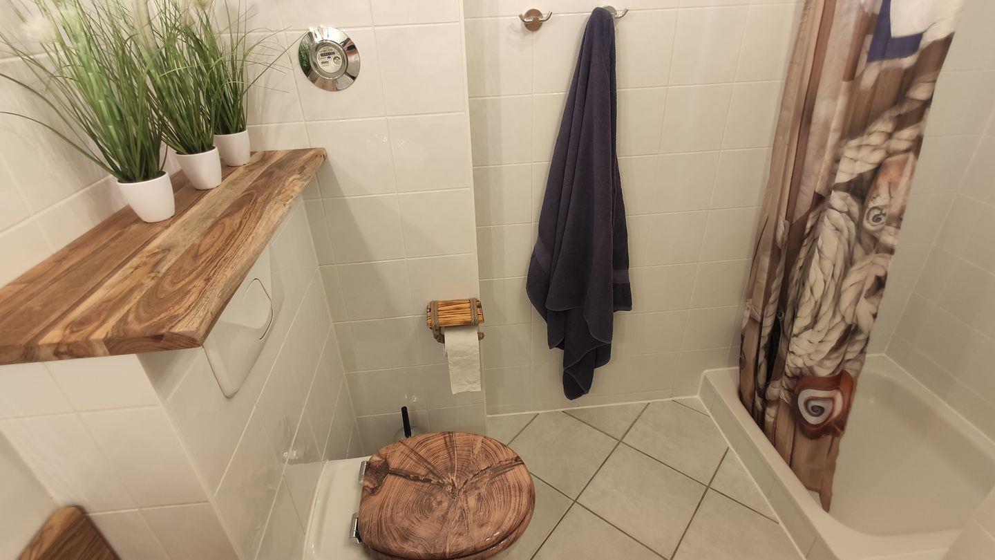 Das gemütliche Schlafzimmer ist mit einem Doppelbett und Stauraum für Ihre Garderobe eingerichtet. Im modernen, maritimen Badezimmer verfügen Sie über eine Dusche, einen Waschtisch, ein WC und einen Föhn und haben somit alles für einen angenehmen Start in den Tag.