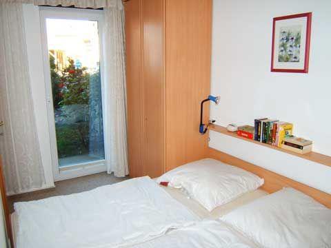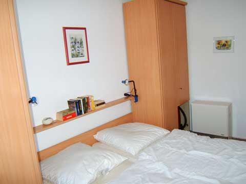 Dem Wohnzimmer angrenzend befindet sich das separate Schlafzimmer mit Doppelbett und ebenfalls Zugang zur Terrasse. Weitere Schlafmöglichkeiten für 2 Personen bietet die ausziehbare Couch im Wohnzimmer.