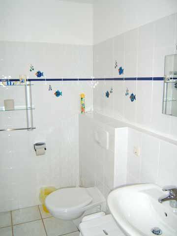 Das Badezimmer verfügt über eine Dusche, einen Waschtisch und ein WC.