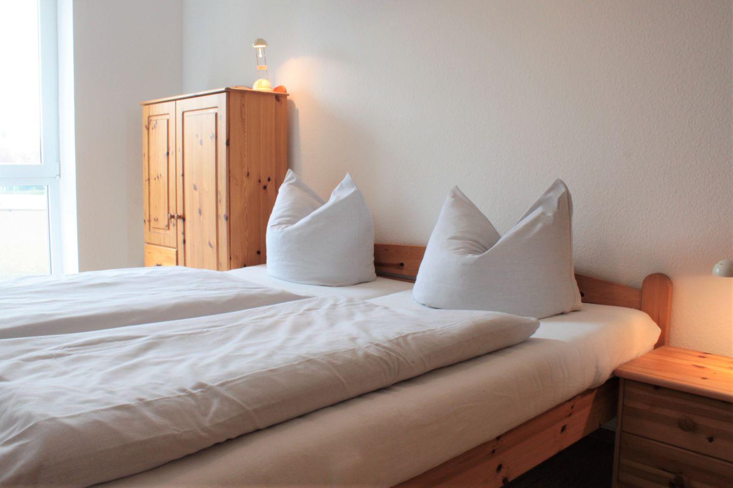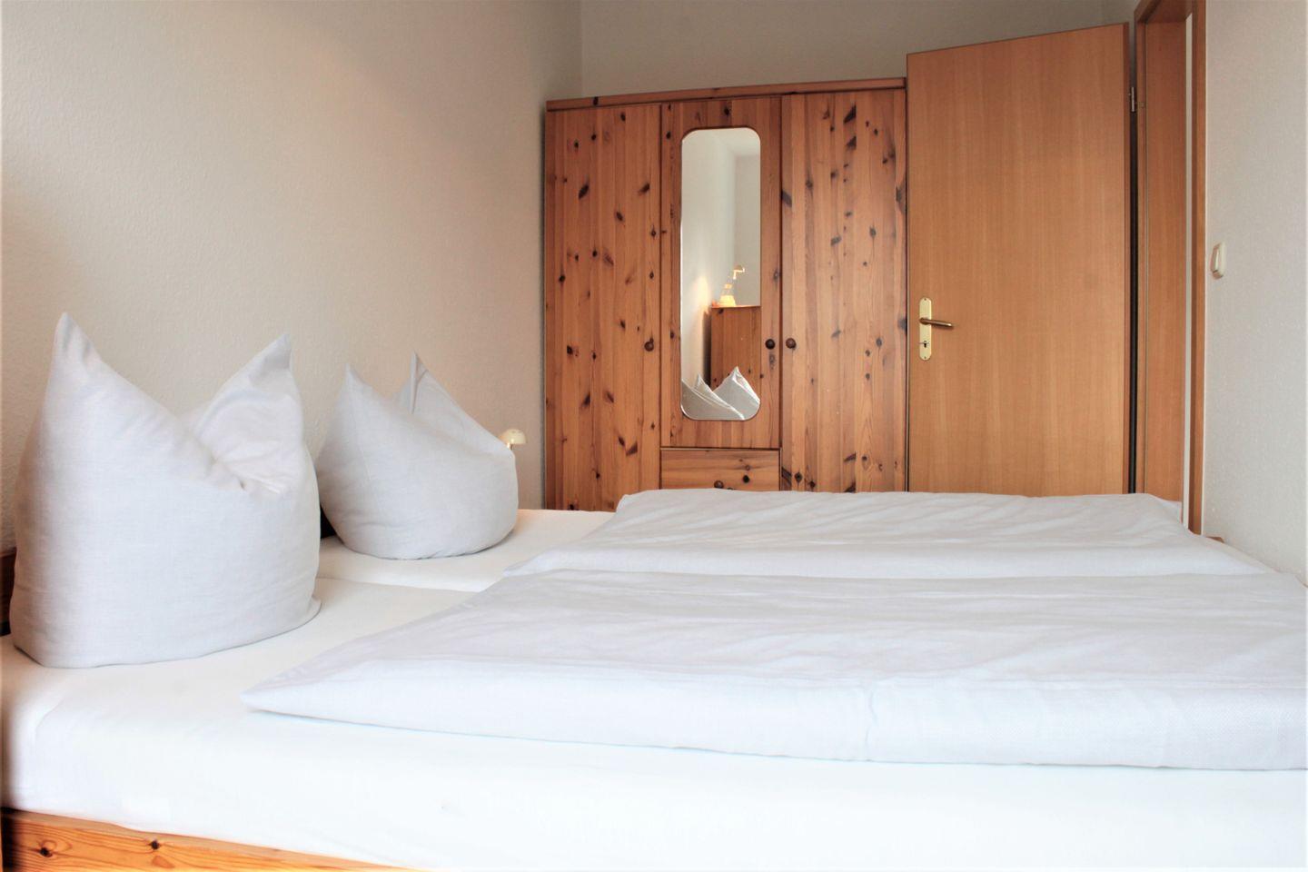 An das Wohnzimmer angrenzend befindet sich das separate Schlafzimmer. Dieses verfügt über ein Doppelbett und einen Kleiderschrank.