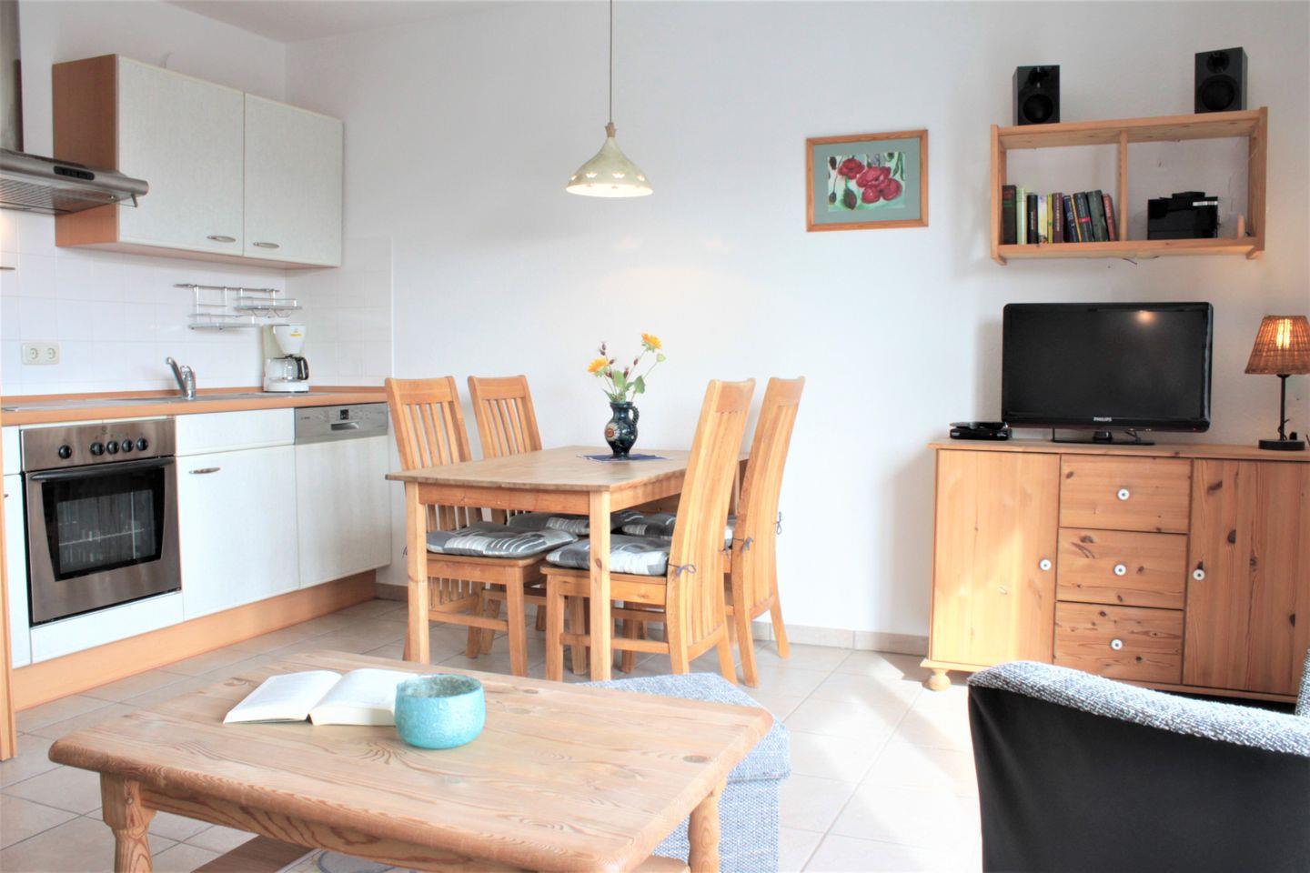 Im Wohnbereich integriert, befindet sich die Küchenzeile, welche mit einem Herd mit Backofen, Kühlschrank mit Gefrierfach, Spülmaschine, Wasserkocher, Kaffeemaschine und einigem mehr ausgestattet ist und gute Voraussetzungen zur Selbstversorgung bietet.