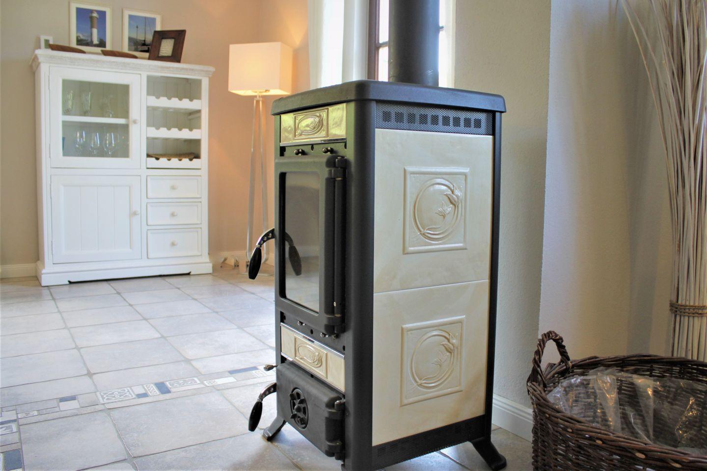 Der gemütliche Kaminofen** sorgt zusätzlich für wohlige Atmosphäre an kuscheligen Abenden. Ansonsten wird das Erdgeschoss mit einer Fußbodenheizung beheizt.