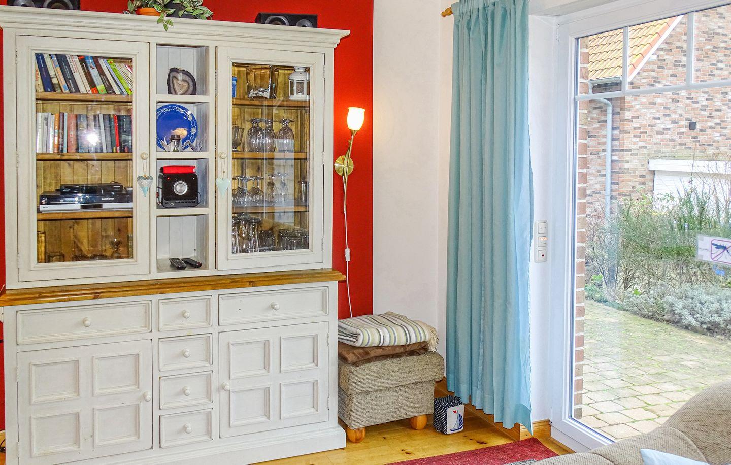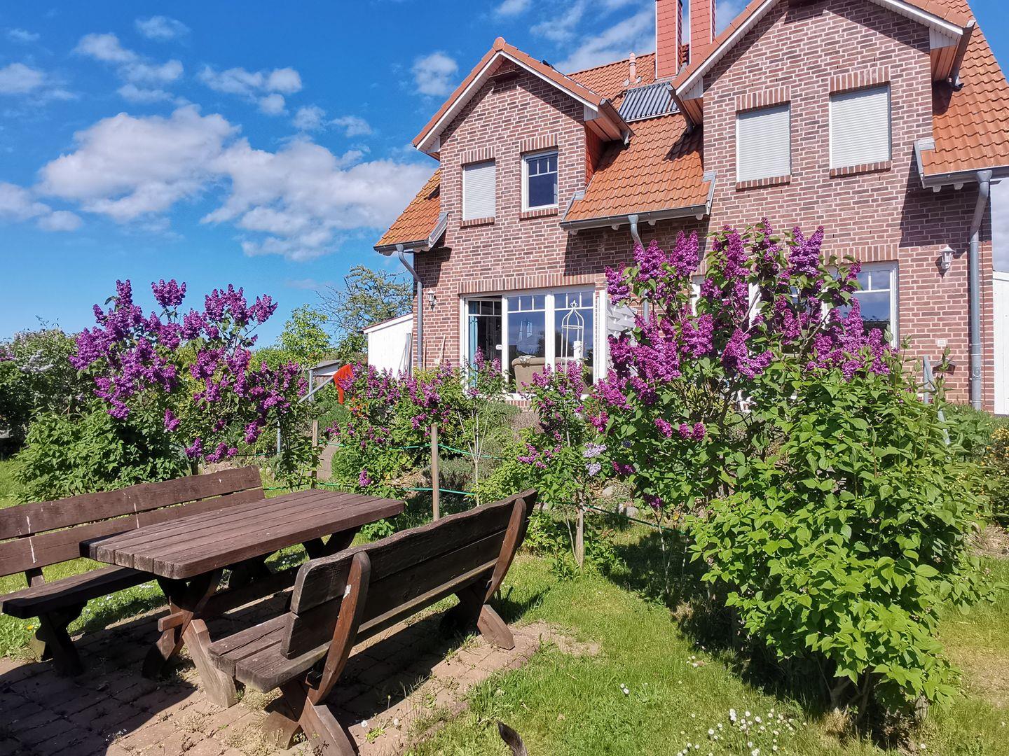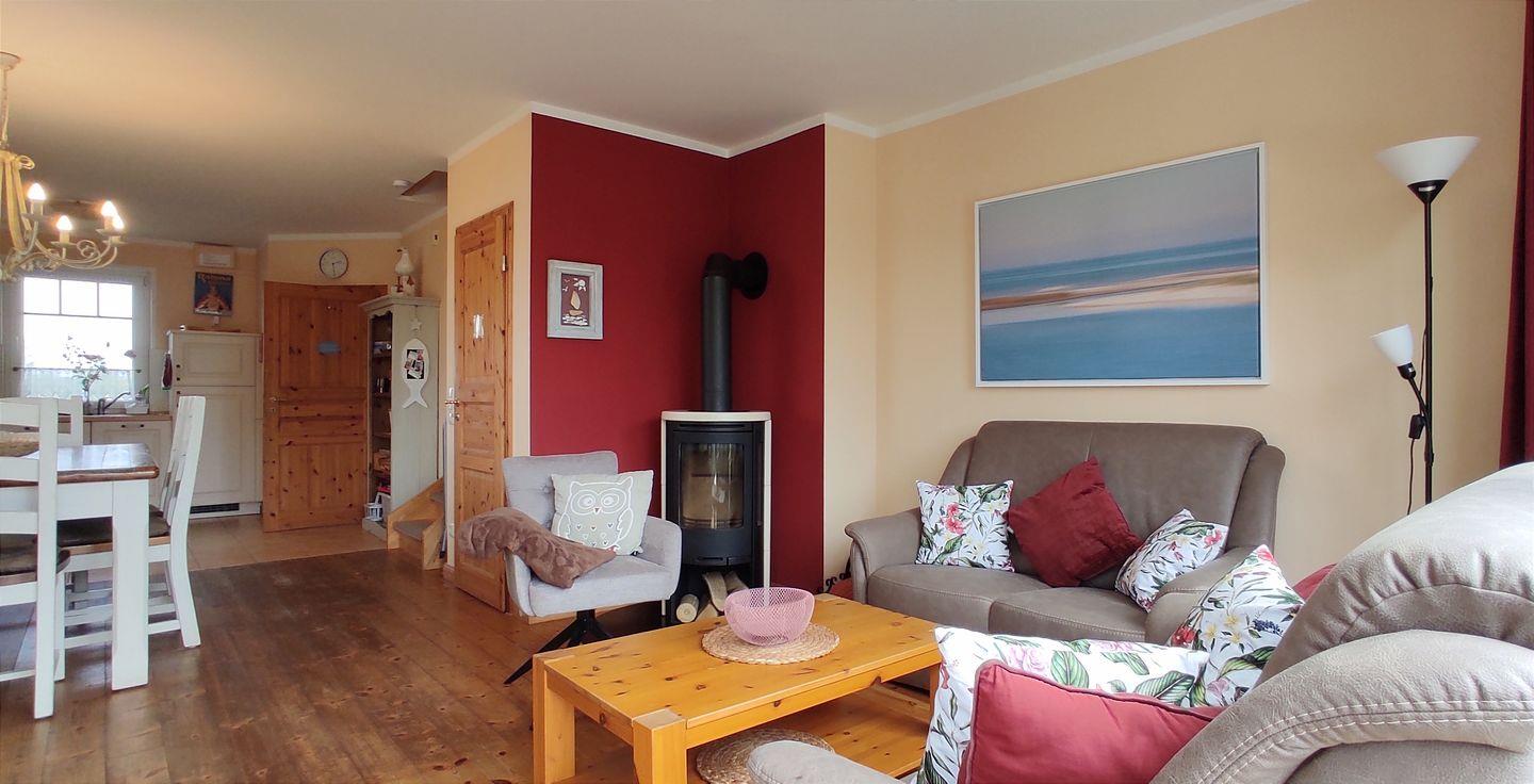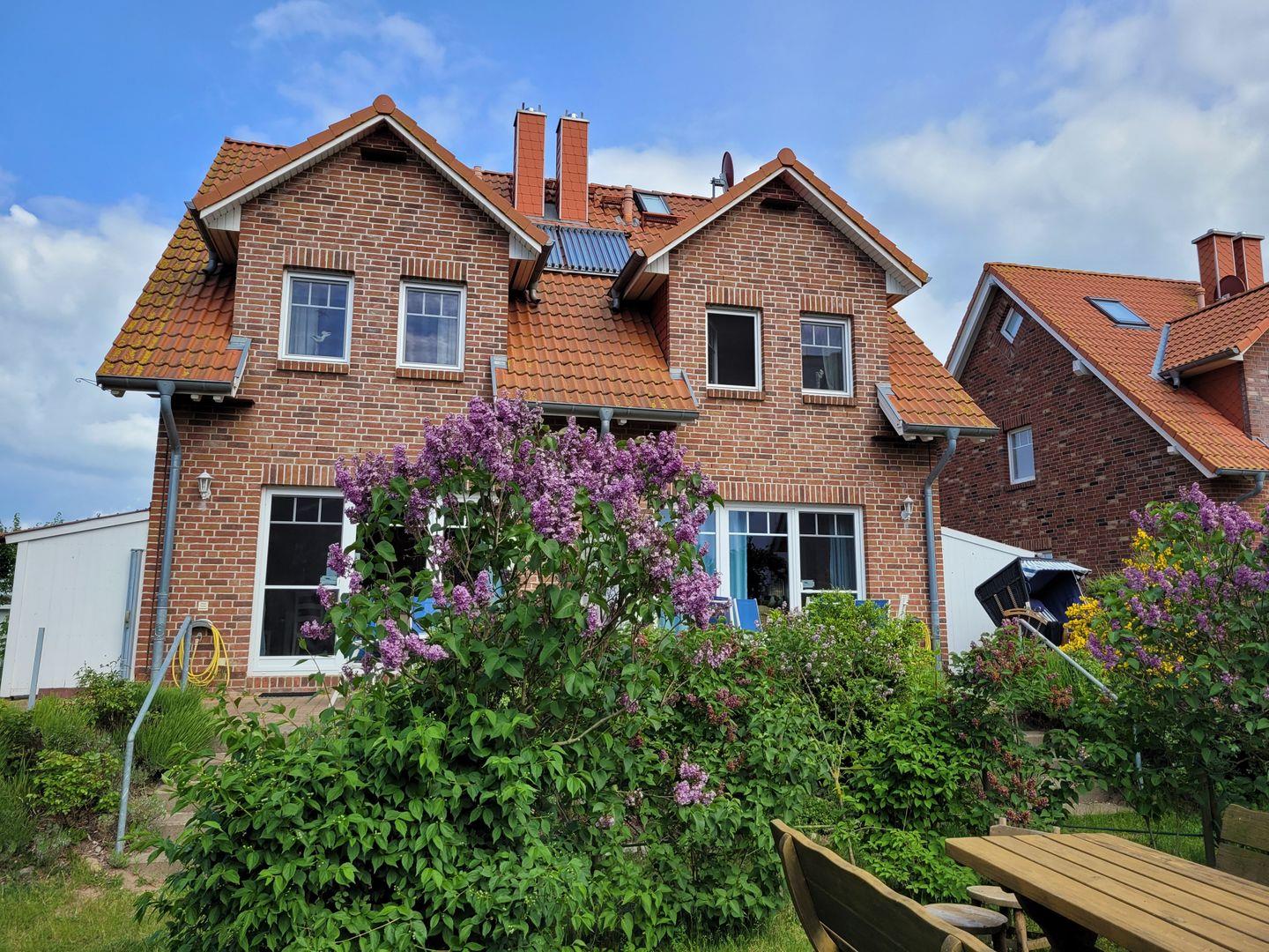Haus Vierjahreszeiten 1: 100 m² großes Nichtraucherhaus für bis zu 6 Personen mit 3 Schlafzimmern, 2 Bädern und offener Küche zum Wohnzimmer. Kaminofen, WLAN, 2 TVs, Sauna zur Eigennutzung und Kicker sorgen für Komfort. Terrasse, Garten mit Möbeln, Grillplatz und Sandkasten. 300 m zum Sandstrand, eingeschränkter Meerblick. 2 Privatparkplätze, Haustiere bis 2 erlaubt.