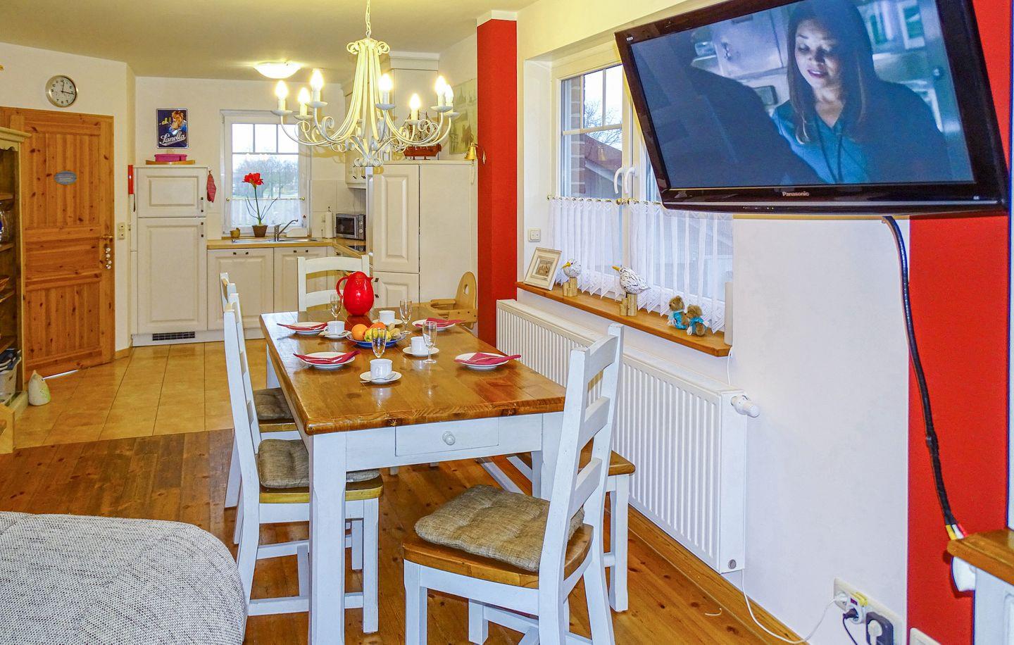 Das geräumige Wohnzimmer ist der ideale Ort, um sich nach einem ereignisreichen Tag zu entspannen. Hier finden Sie eine gemütliche Couch, einen Fernseher und einen DVD-Player. Eine Auswahl an DVDs steht ebenfalls für Ihren Filmabend bereit. Der Kaminofen sorgt für wohlige Wärme und eine entspannte Atmosphäre, besonders in den kühleren Monaten.