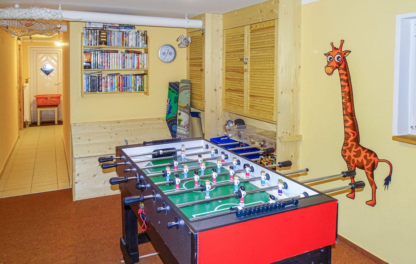 Das Ferienhaus bietet zudem einen gemeinschaftlichen Bereich, der zusammen mit der anderen Haushälfte genutzt werden kann. Hier finden Sie einen Kickertisch, einige Spiele und einen Waschraum mit Trockner und Waschmaschine.