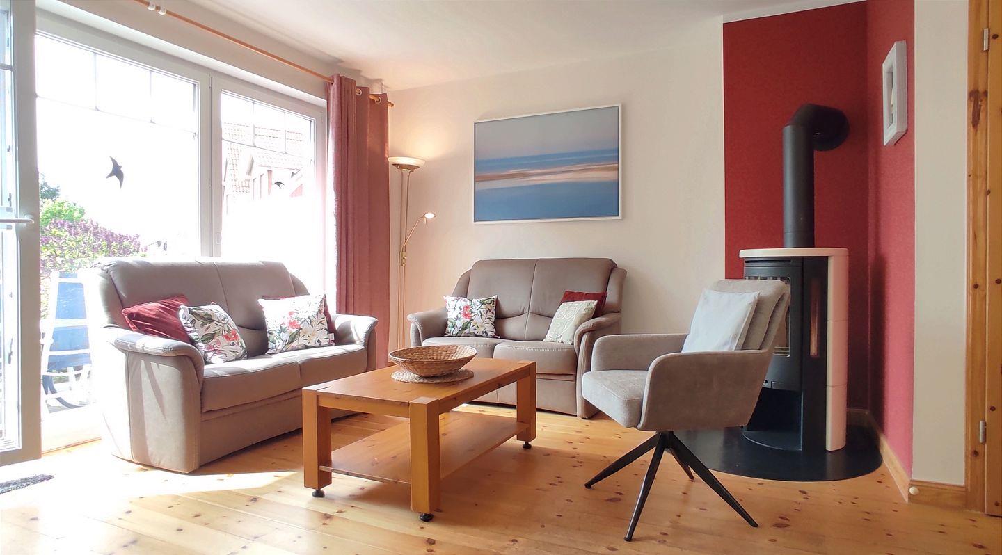 Haus Vierjahreszeiten 2: 100 m² auf 4 Etagen für bis zu 6 Personen mit 3 Schlafzimmern und 2 Bädern (2 Duschen). Nur 300 m zum Sandstrand/Meer, mit eingeschränktem Meerblick sowie Garten- und Landschaftsblick. Offene Küche zum Wohnzimmer mit Ceranherd, Backofen, Spülmaschine und Espressomaschine. Eigene Sauna, Kaminofen, WLAN, 2 TVs, Terrasse, Garten mit Grillplatz. Haustiere (max. 2) erlaubt, 2 Privatparkplätze.