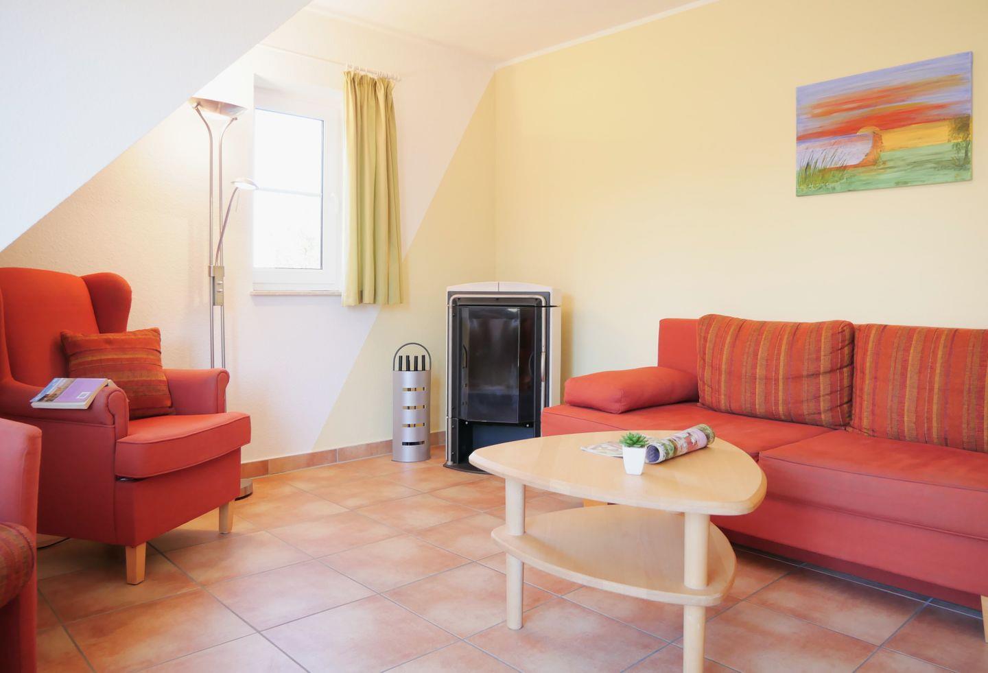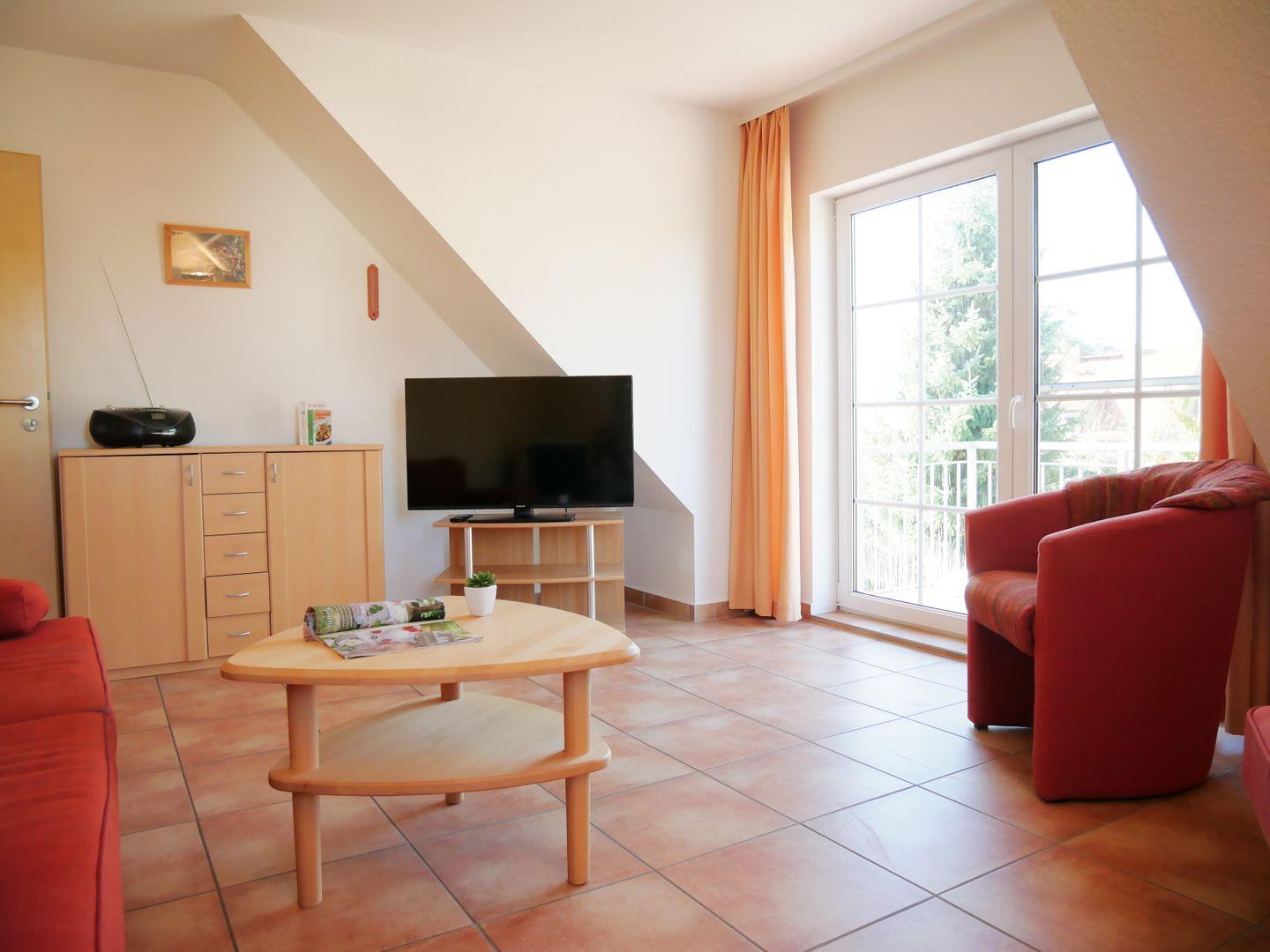 Die Wohnung verfügt über ein geräumiges Wohnzimmer mit Couch, TV, WLAN und Kamin. Außerdem befindet sich hier der Zugang zum möblierten Balkon.