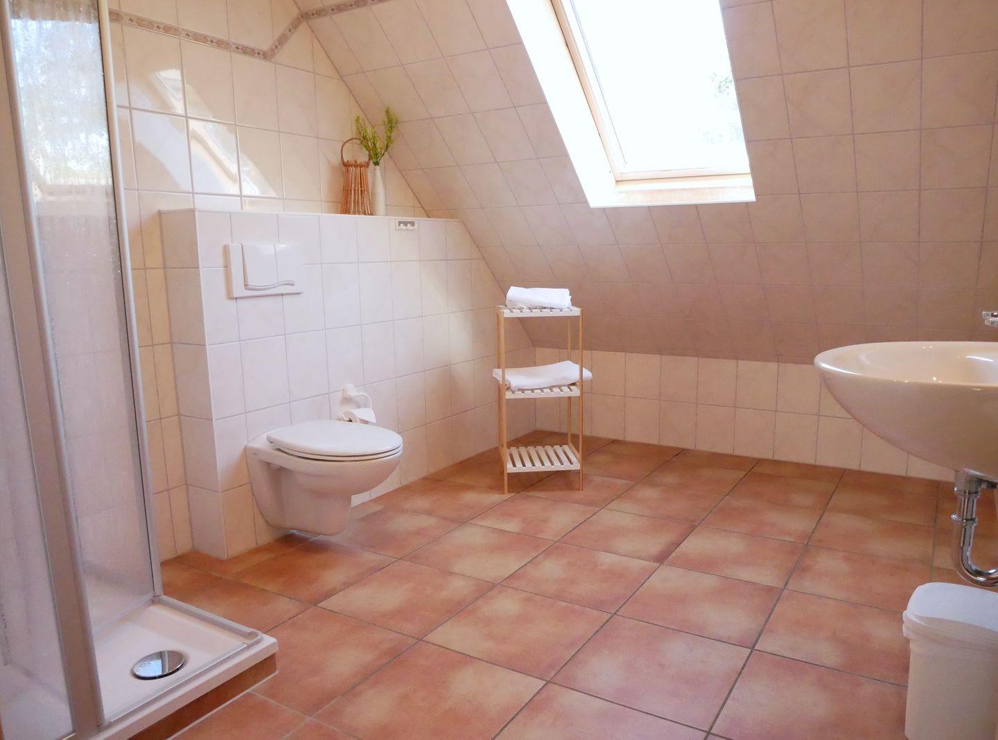 Im Badezimmer befindet sich eine Dusche mit tiefem Einstieg, WC, Waschtisch und Föhn.