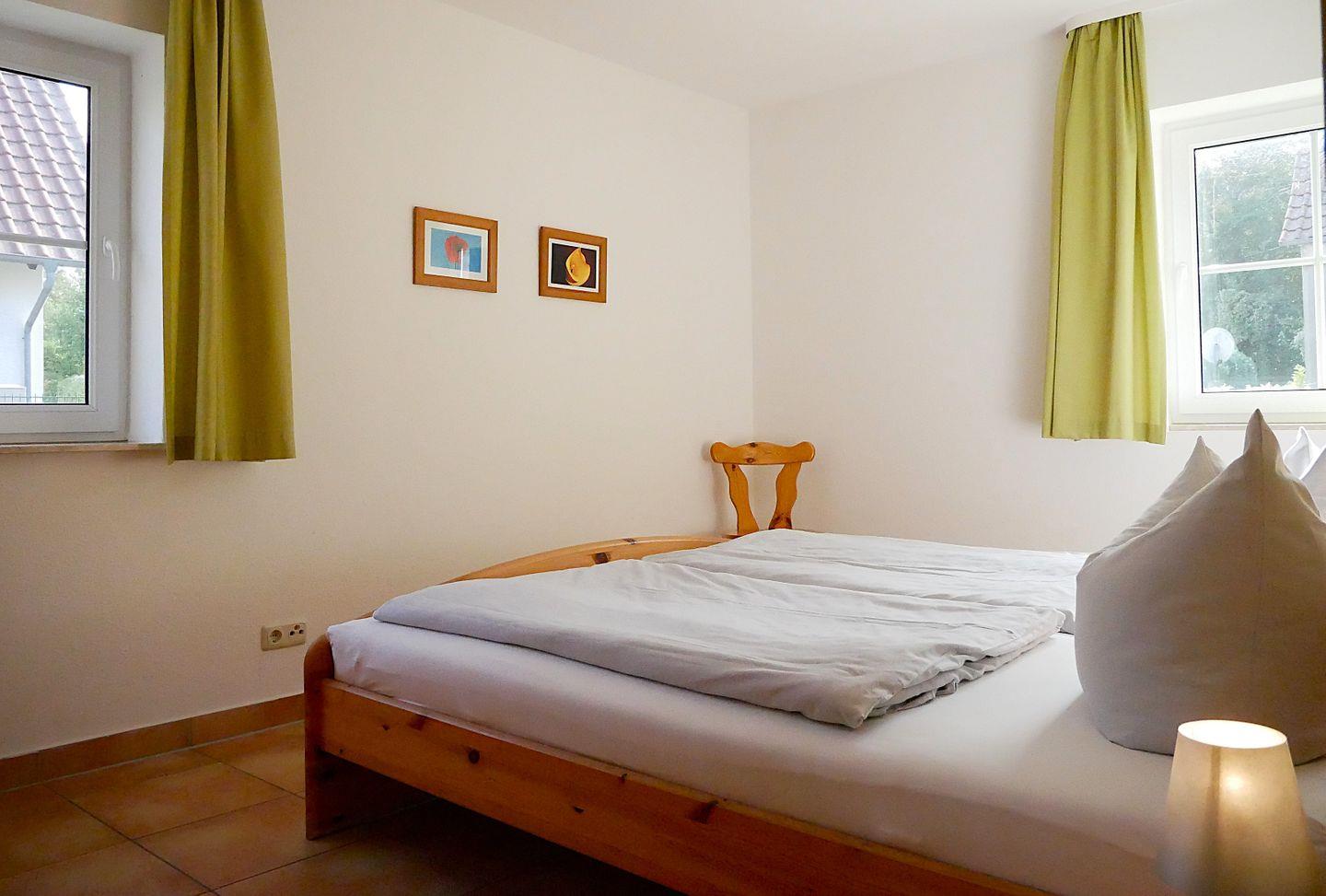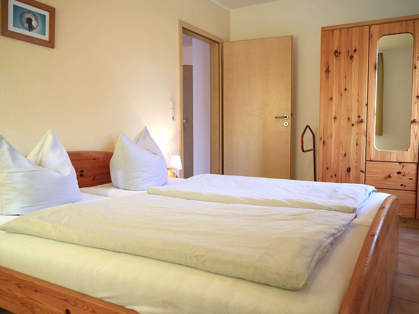 Das Schlafzimmer ist mit einem Doppelbett (180x200cm/getrennte Matratzen) und einem Kleiderschrank möbliert.