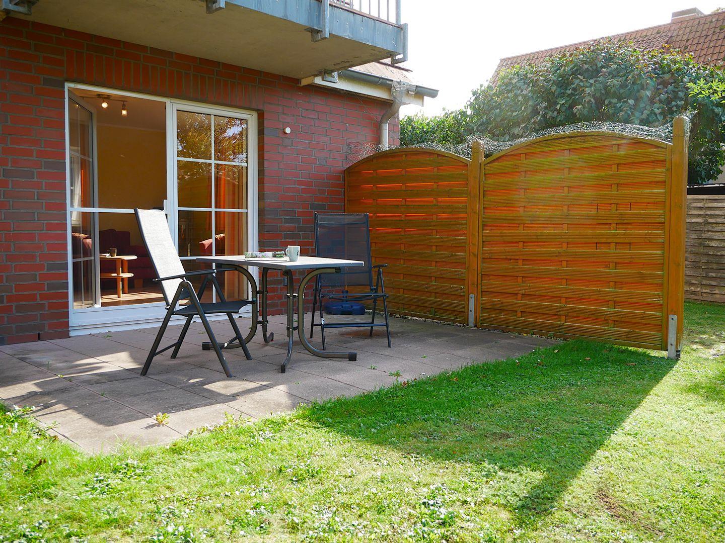 Das helle Wohnzimmer bietet Ihnen ein Sofa, einen Lesesessel, TV. WLAN und einen Kamin. Außerdem befindet sich hier der Zugang zur möblierten Terrasse.