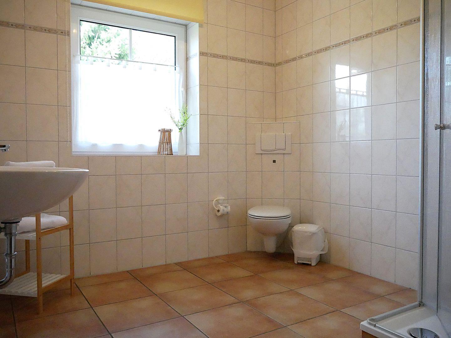 Im Badezimmer steht eine Dusche mit tiefem Einstieg, WC, Waschtisch und Föhn für Sie breit.