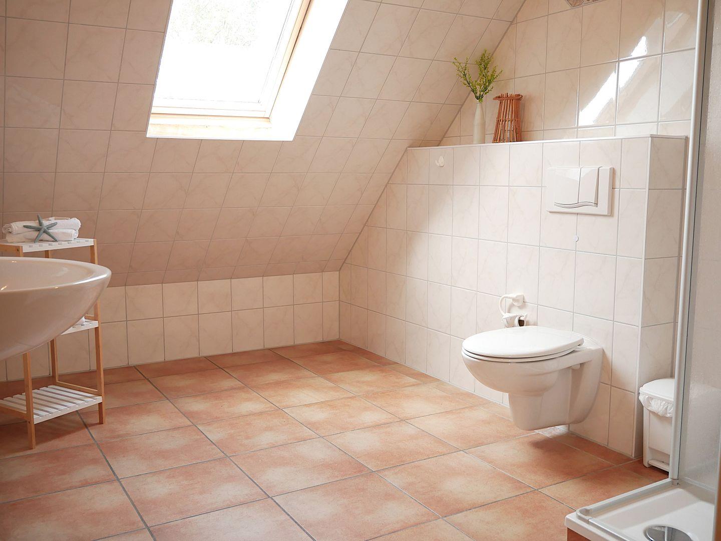 Im Badezimmer befindet sich eine Dusche mit tiefem Einstieg, WC, Waschtisch und Föhn.