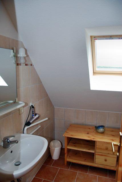 Das helle Tageslichtbadezimmer verfügt über eine Dusche, eine Sauna, einen Waschtisch und ein WC.