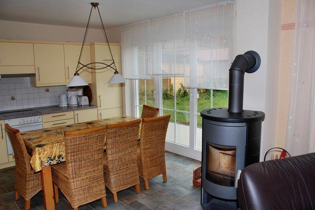 Im kombinierten Wohn- und Essbereich verfügen Sie über eine bequeme Sofalandschaft, einen TV mit DVD- Player und einen Kaminofen, der für wohlige Wärme sorgt.