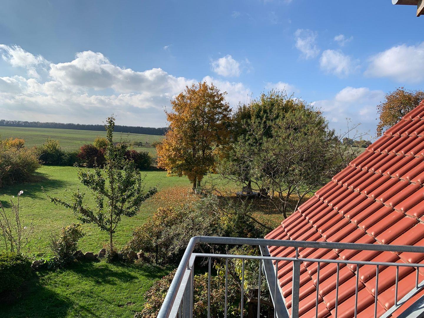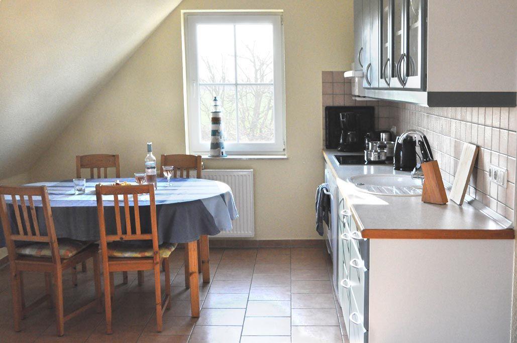 Der kombinierte Wohn- und Essbereich ist mit einer gemütlichen Sofalandschaft, TV-Gerät und Kaminofen, der an kühleren Tagen für eine wohlige Atmosphäre sorgt, ausgestattet. Von hier gelangen Sie außerdem auf den möblierten Balkon, von dem aus Sie einen idyllischen Weitblick auf die umliegenden Felder und Wiesen haben. Die moderne integrierte Küche mit Esstisch bietet viele technische Geräte, die Sie benötigen. Dazu gehören z.B. ein Geschirrspüler, ein Herd mit Backofen, ein Kühlschrank mit Gefrierfach, Mikrowelle, Kaffeemaschine und vieles mehr.