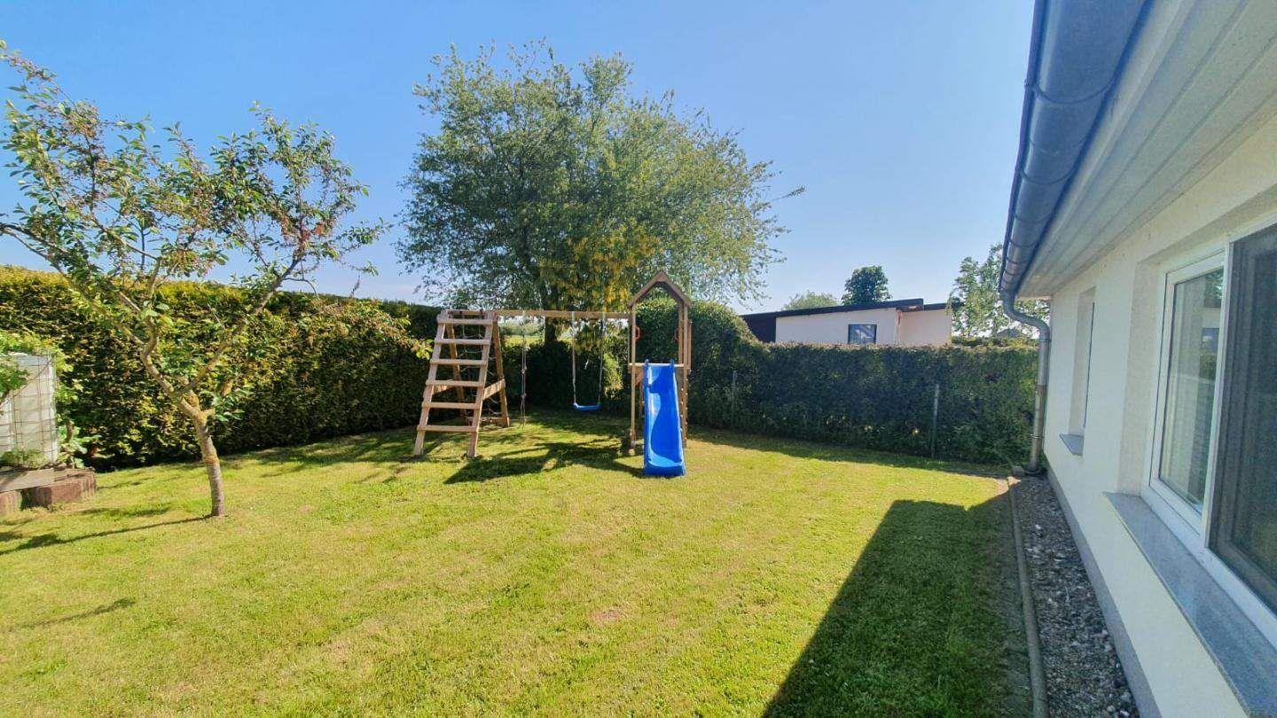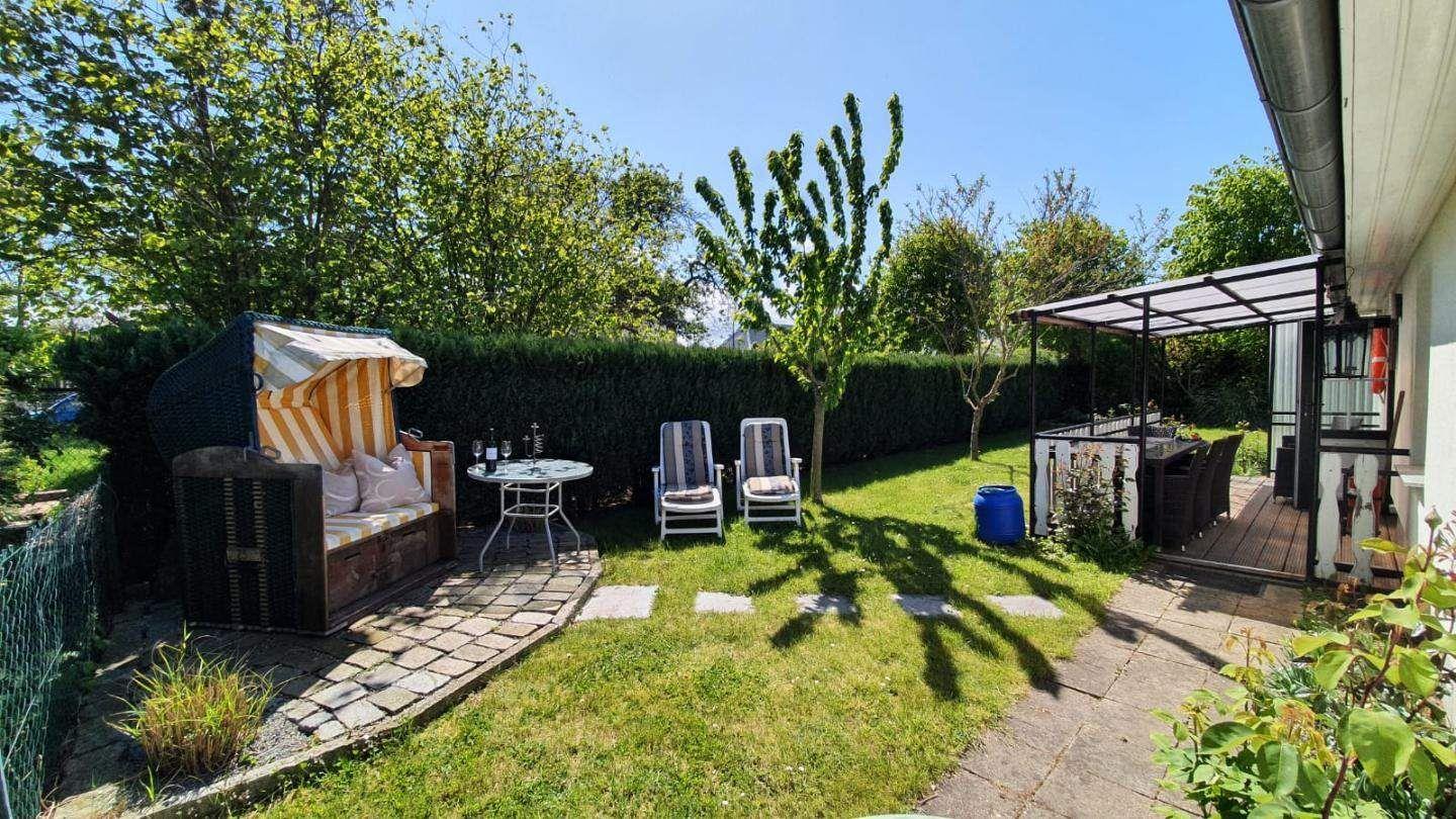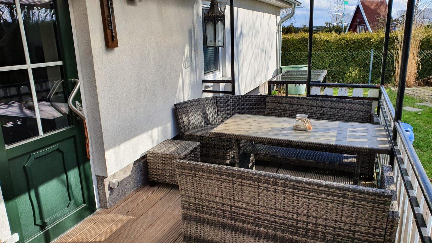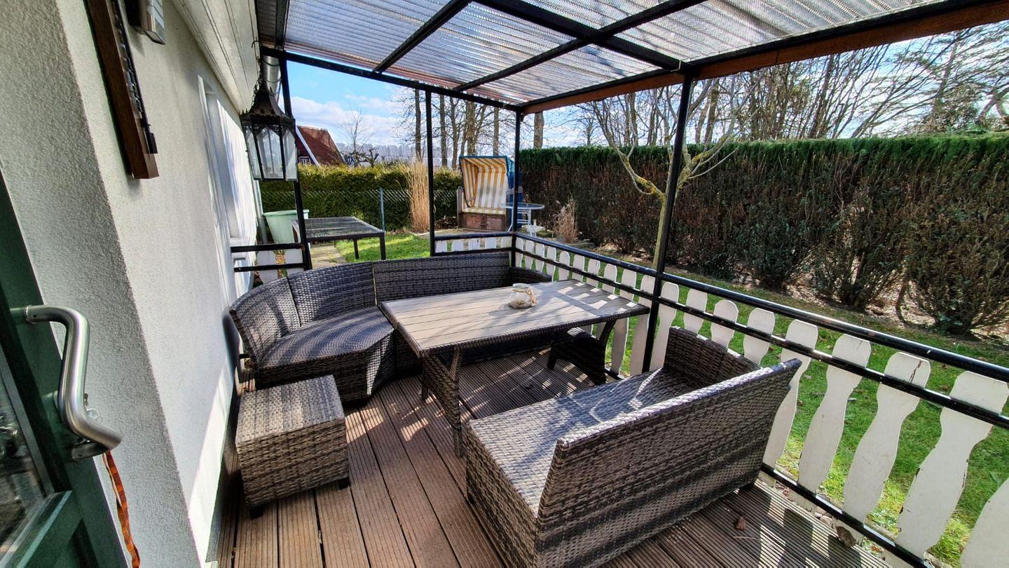 Auf der möblierten, überdachten Terrasse ist genügend Platz für gesellige Abende. Zwei Liegestühle im Garten runden das Angebot ab.