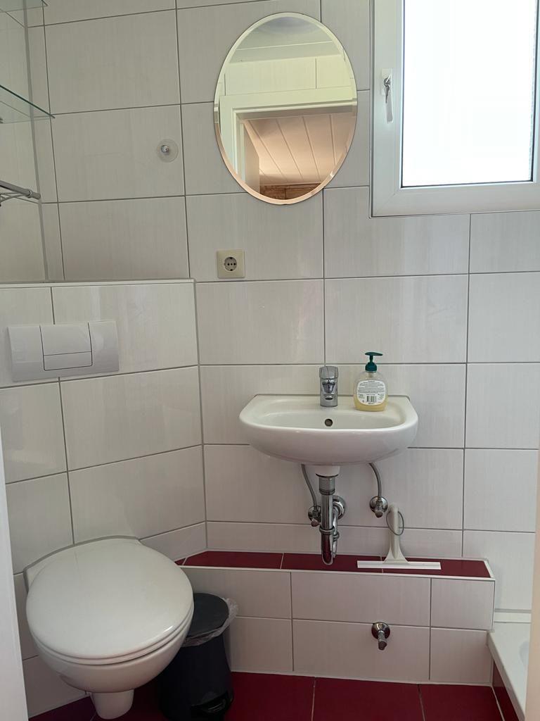 Das Badezimmer mit Fenster bietet Ihnen eine Dusche, einen Waschtisch, ein WC und einen elektronischen Handtuchheizkörper zum Heizen.
