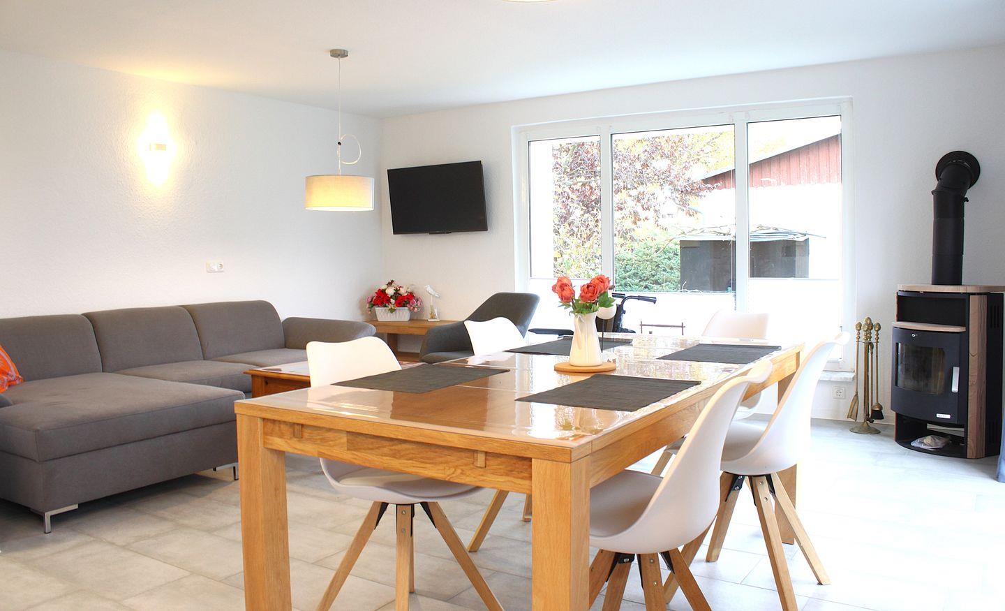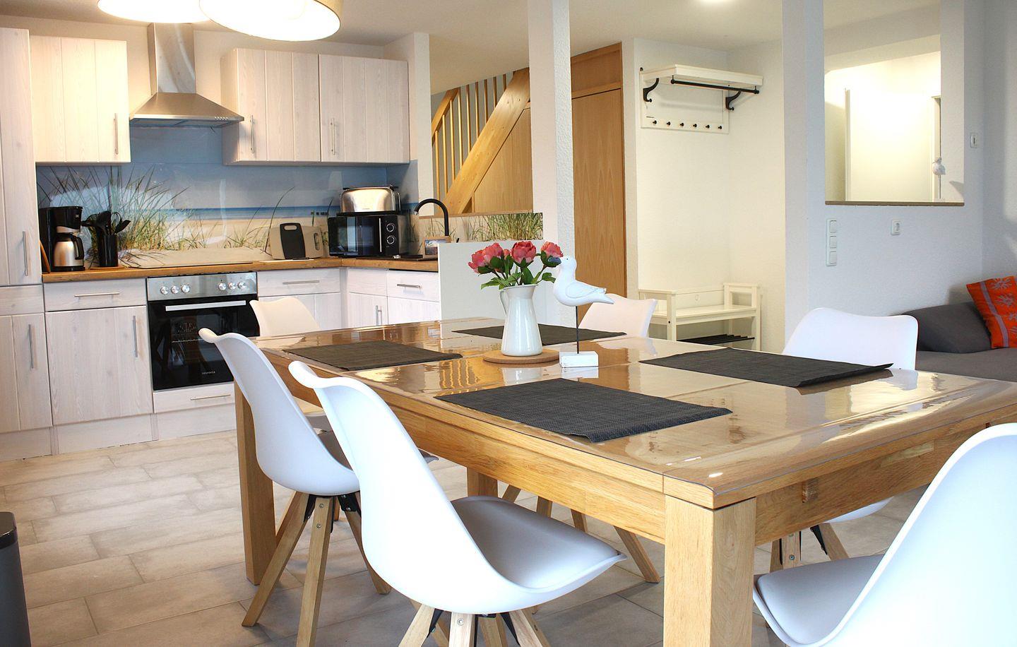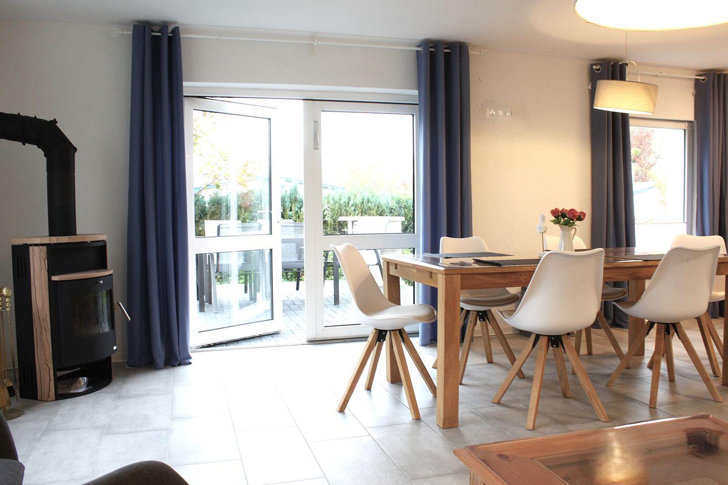 Das Erdgeschoss des Hauses bietet Ihnen zwei separate Schlafzimmer, ein Badezimmer und einen großzügigen, hellen Wohn- und Essbereich mit integrierter offen gestalteter Küche. Diese ist mit allen technischen Geräten, wie z.B. Kühlschrank mit Gefrierfach, Geschirrspüler, Herd mit Backofen, Kaffeemaschine, Mikrowelle und vielen weiteren Geräten ausgestattet. Am großen Esstisch finden alle Gäste bequem Platz. Das komfortable Sofa ermöglicht Ihnen entspannte Stunden vor dem TV-Gerät oder Blick auf den Kamin.