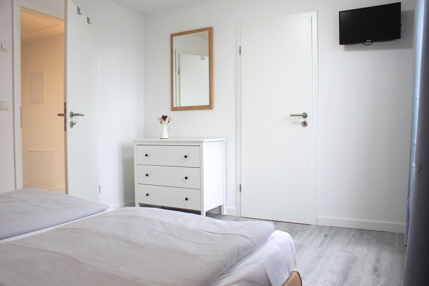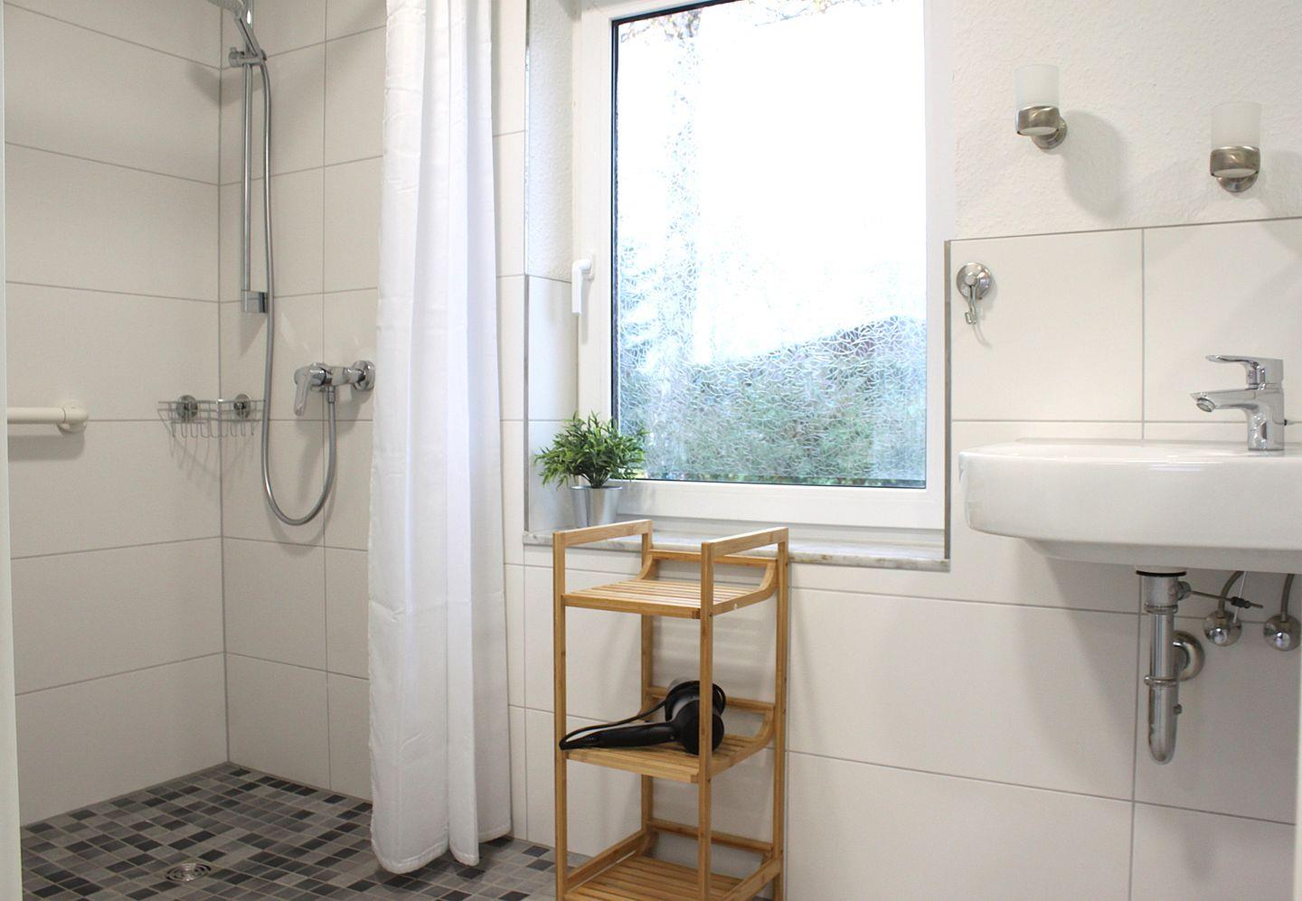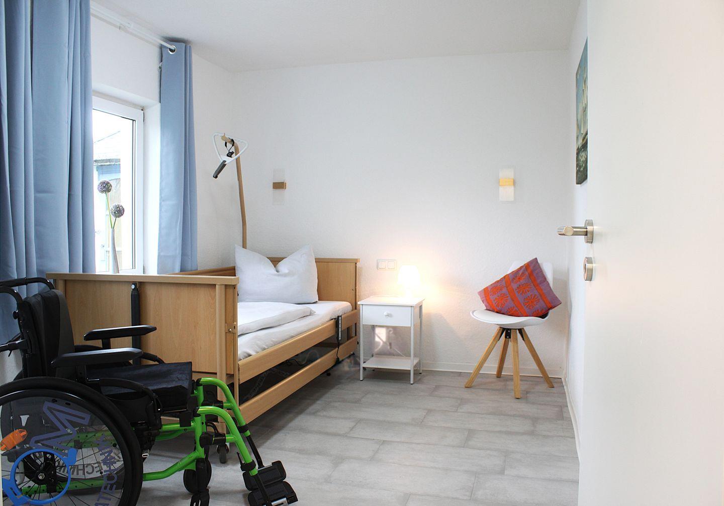 Die separaten Schlafzimmer verfügen jeweils über ein Einzelbett, einen Kleiderschrank und TV-Geräte. Ein Schlafzimmer ist mit einer breiteren Tür und einem höhenverstellbaren Pflegebett mit Haltegriff ausgestattet und bietet somit einem Rollstuhlfahrer einen angenehmen Rückzugsort. Auch das Tageslichtbadezimmer bietet mit seinem unterfahrbaren Waschbecken, der ebenerdigen Dusche mit Haltegriff und den auf Wunsch verfügbaren Duschstuhl und Stützgriff für das WC, gute Voraussetzungen für einen entspannten Urlaub mit Rollstuhl.