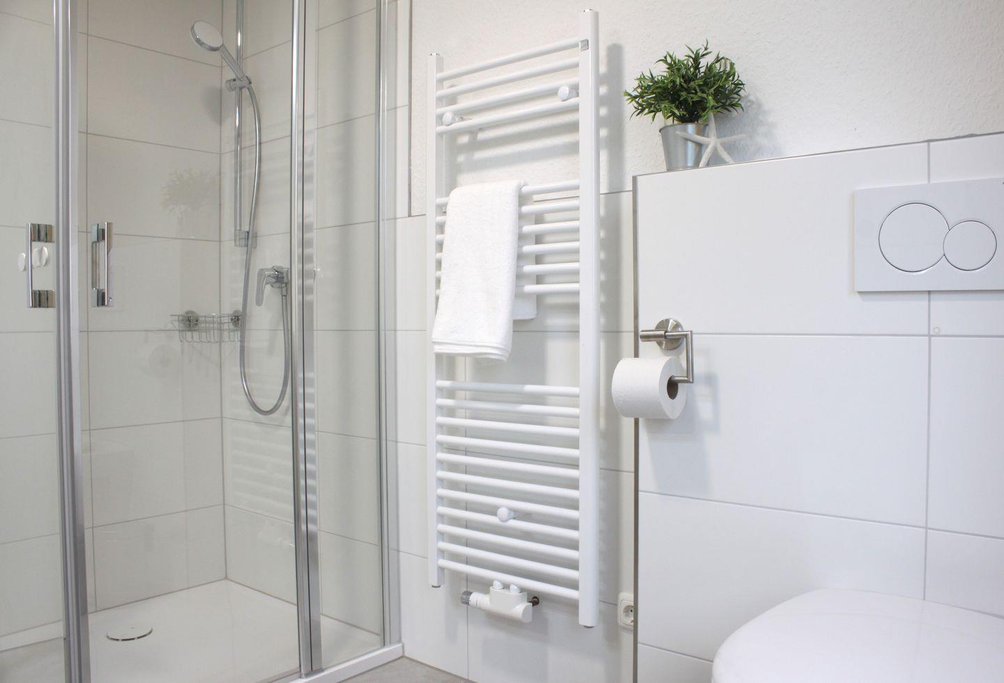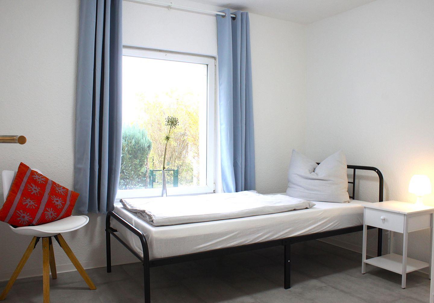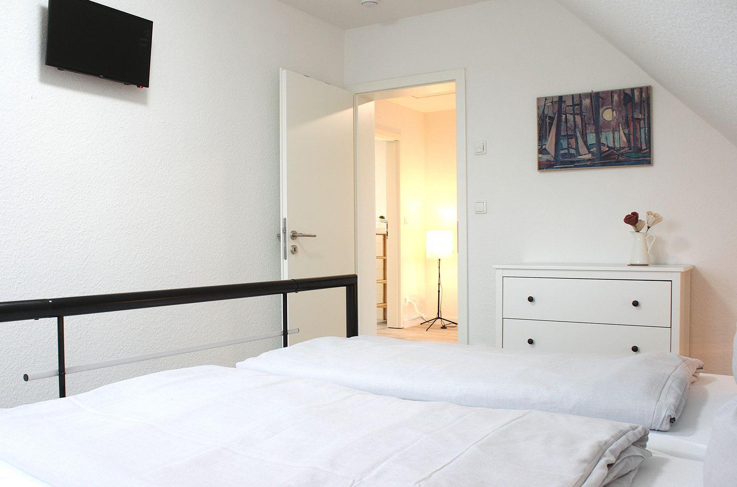 Die separaten Schlafzimmer verfügen jeweils über ein Einzelbett, einen Kleiderschrank und TV-Geräte. Ein Schlafzimmer ist mit einer breiteren Tür und einem höhenverstellbaren Pflegebett mit Haltegriff ausgestattet und bietet somit einem Rollstuhlfahrer einen angenehmen Rückzugsort. Auch das Tageslichtbadezimmer bietet mit seinem unterfahrbaren Waschbecken, der ebenerdigen Dusche mit Haltegriff und den auf Wunsch verfügbaren Duschstuhl und Stützgriff für das WC, gute Voraussetzungen für einen entspannten Urlaub mit Rollstuhl.