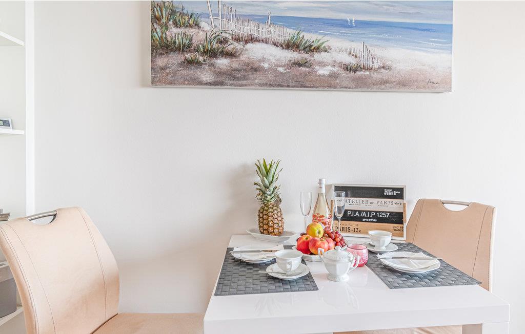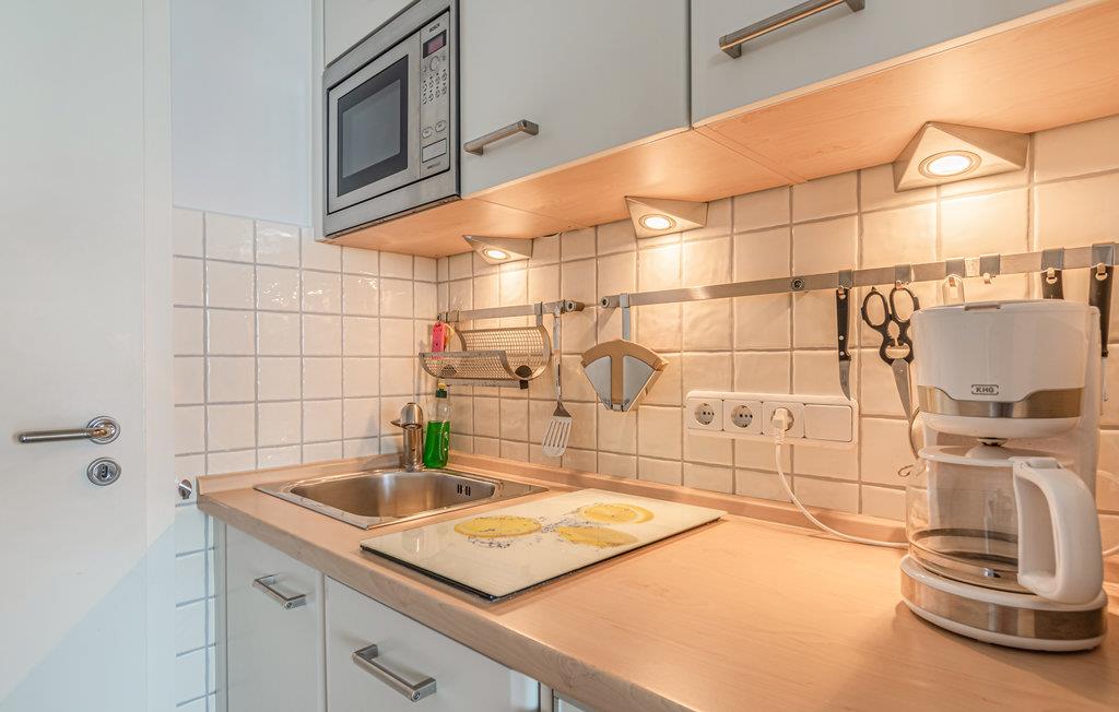Lejligheden har en dejlig opholds- og spiseplads med et lille, men fuldt udstyret køkken. En sammenklappelig seng af høj kvalitet fungerer som et hyggeligt sted at sove. Det store vindue og altandøren giver også en fantastisk udsigt herfra. Det moderne brusebad lader intet tilbage at ønske. Boligen er renoveret i 2021.