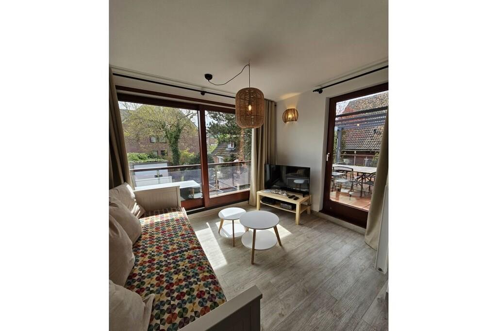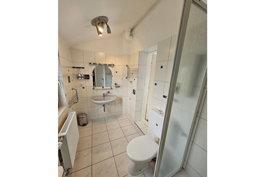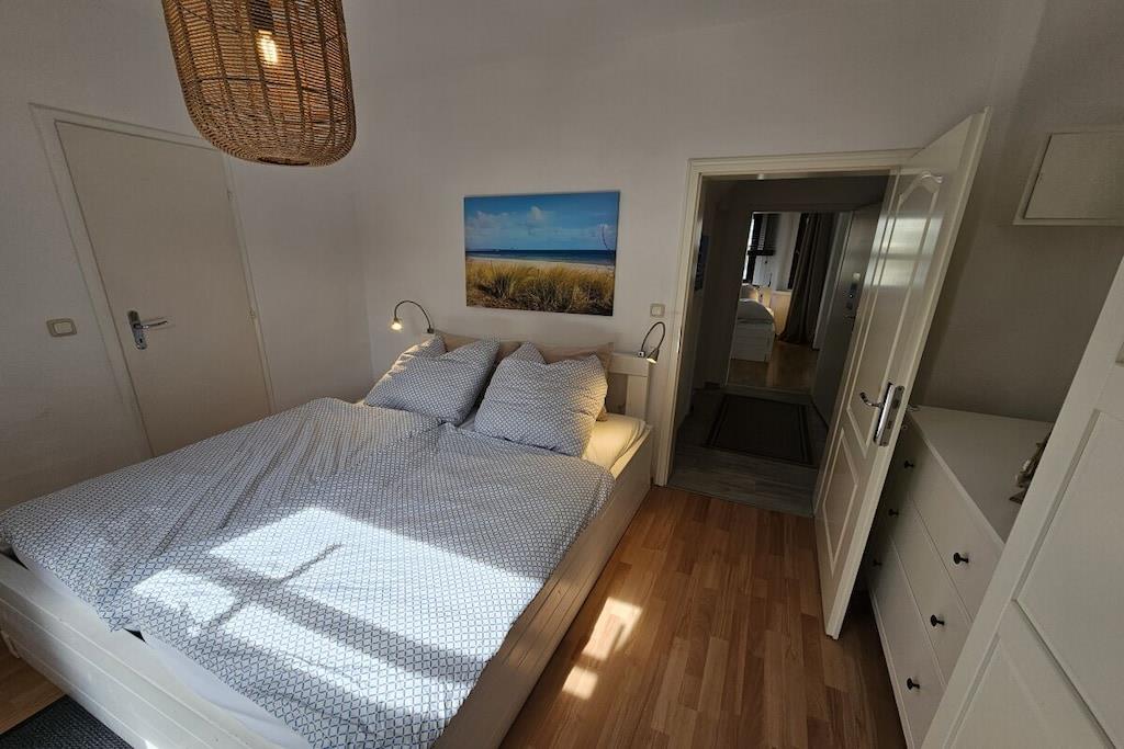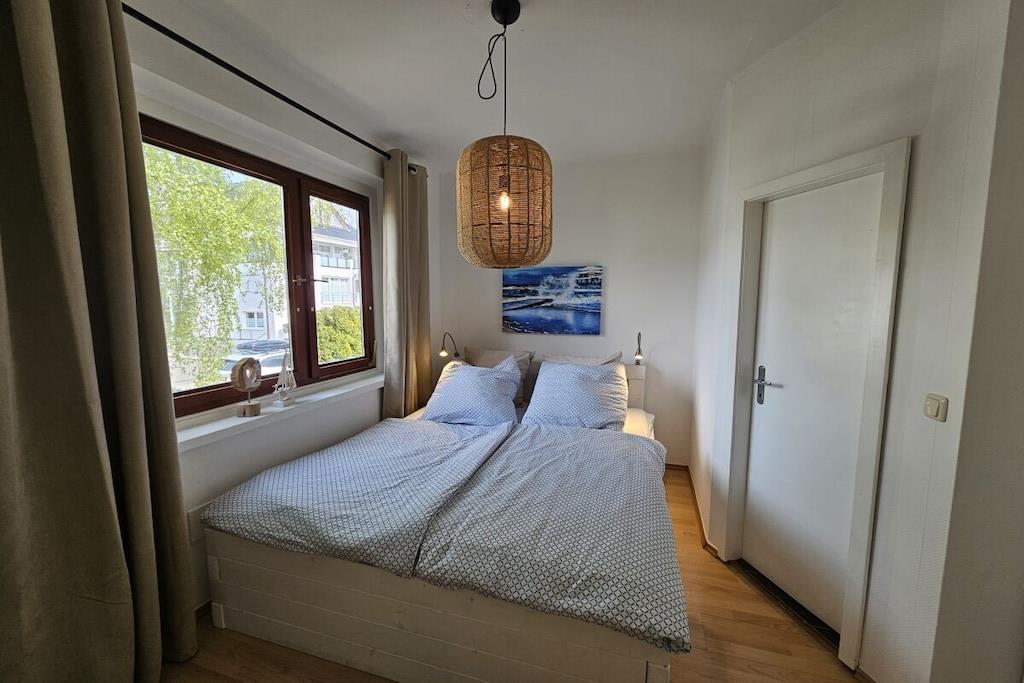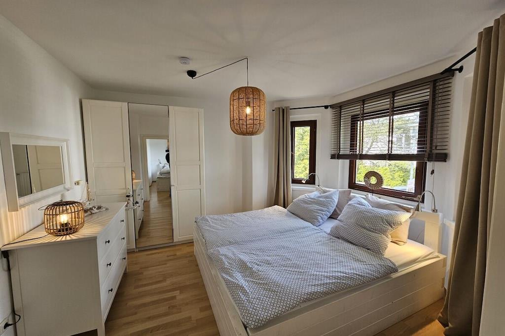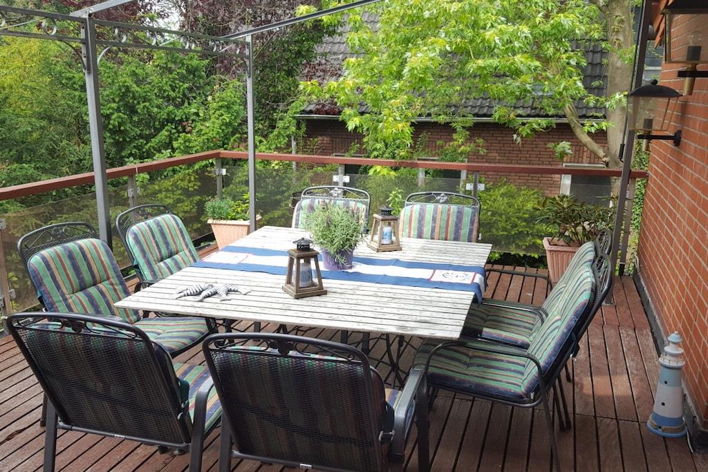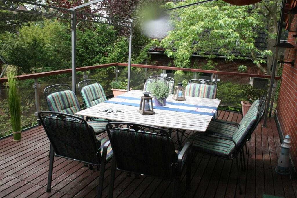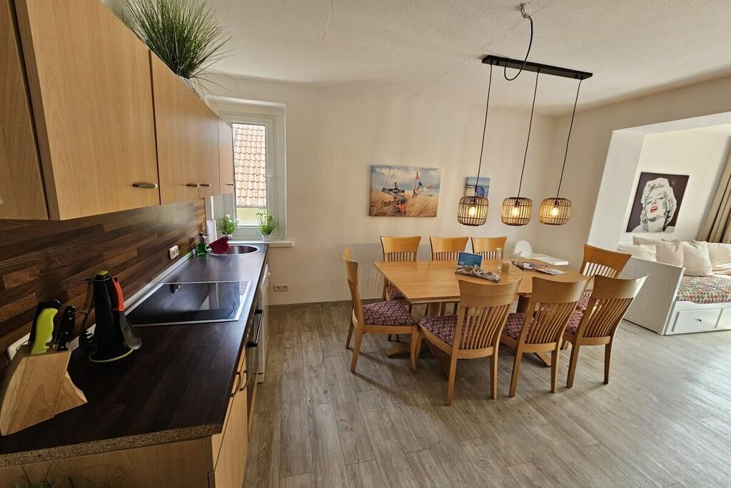 Die Ferienwohnung ist liebevoll und gemütlich eingerichtet. Sie ist für bis zu 8 Personen geeignet und 90 m² groß. Sie besteht aus 3 Schlafzimmern und einem Wohnraum mit Schlafsofa. Die separate Küche ist unter anderem mit einem Geschirrspüler, einem Backofen,einer Kaffeemaschine, einem Kühlschrank mit Gefrierfach sowei mit umfangreichem Zubehör ausgestattet. Eine Selbstverpflegung ist problemlos möglich. Die Wohnung hat 2 Badezimmer mit Dusche. Außerdem ist eine große Dachterrasse mit Stühlen und Tisch vorhanden