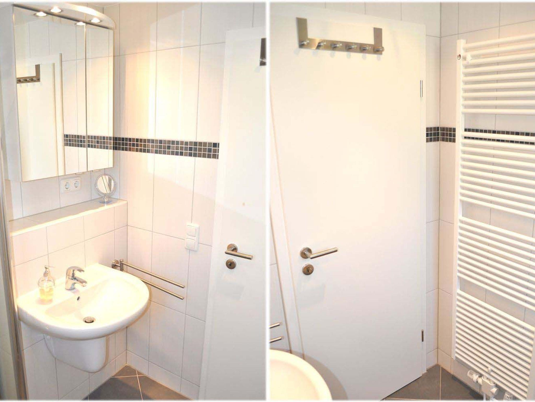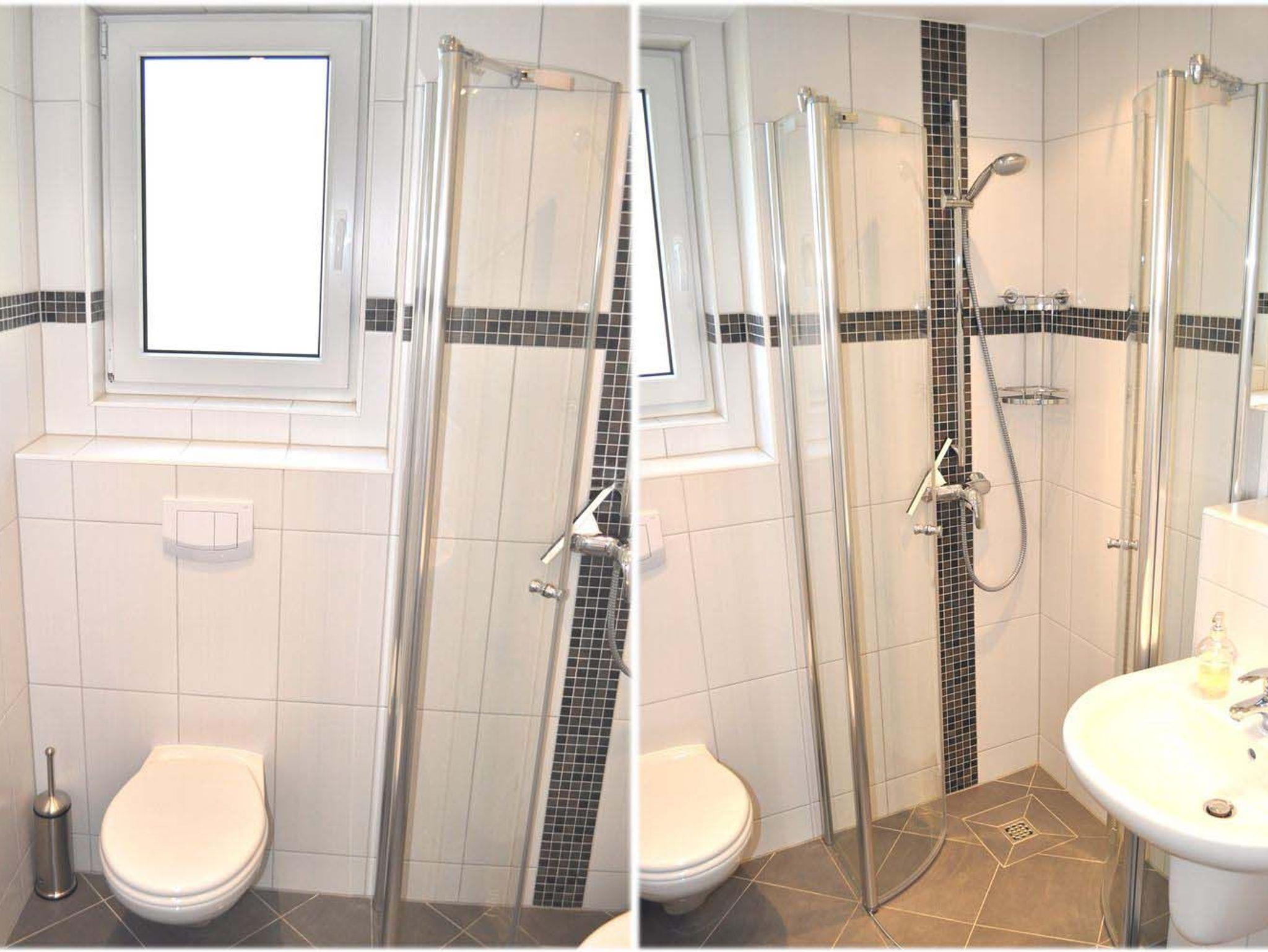 Bad 1: Dusche bodengleich, Duschkabine, Fön, Kosmetikspiegel, Spiegelschrank, Waschbecken, WC
