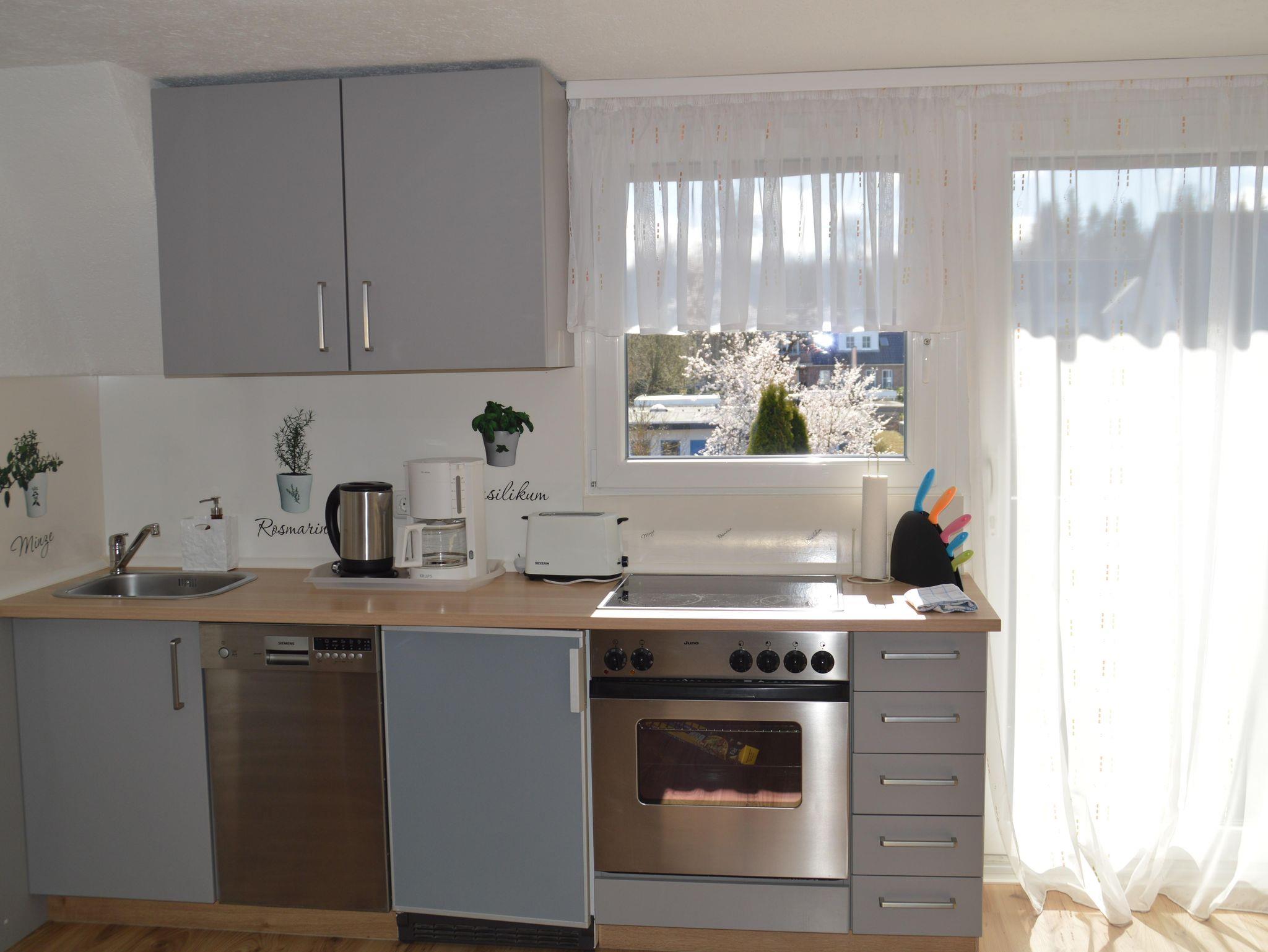 • Miniküche mit Kühlschrank, Backofen, Kaffemaschine, Wasserkocher usw