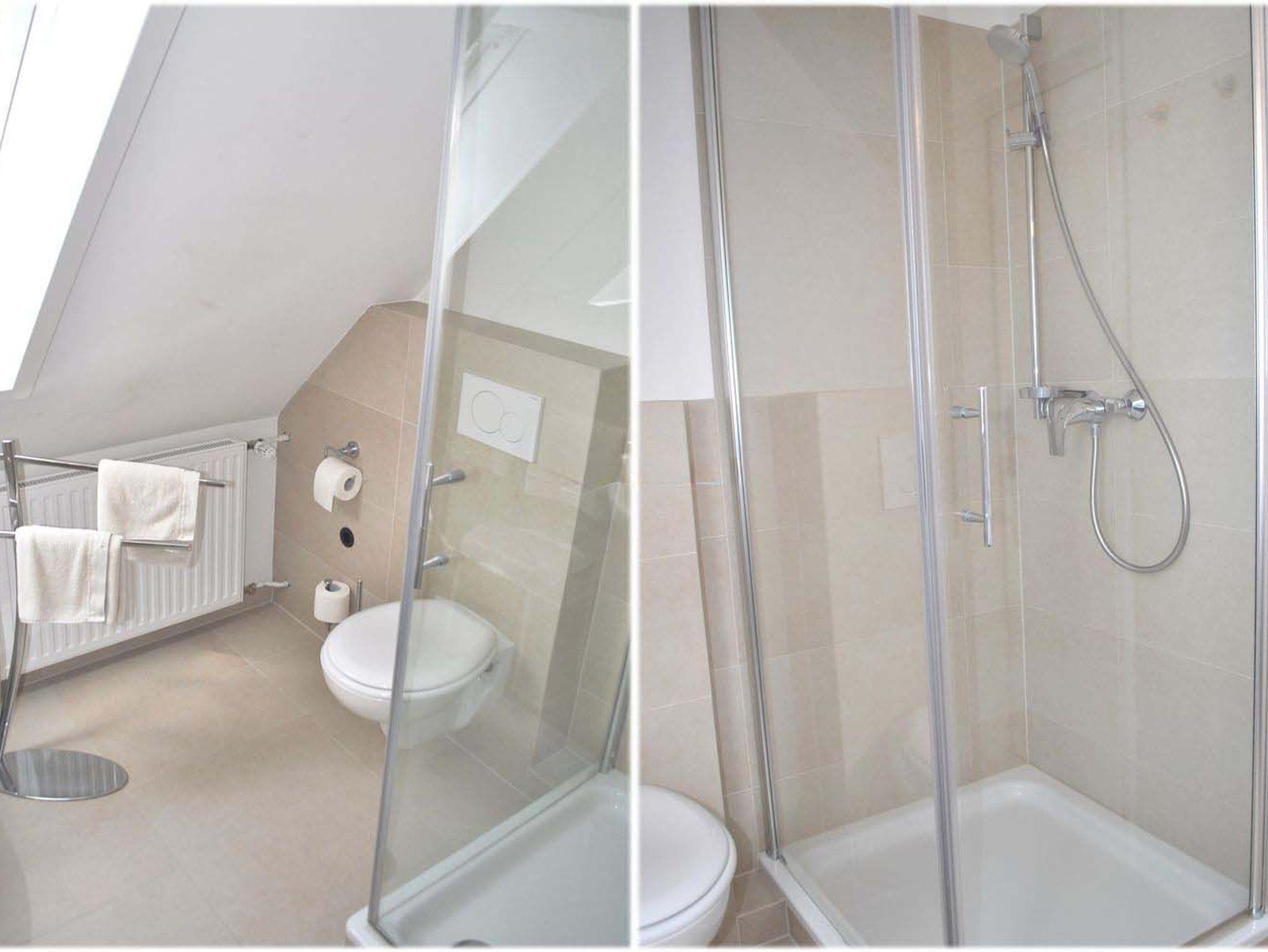 Bad 1: Dusche, Duschkabine, Fön, Handtuchständer, Hocker, Rollwagen, Spiegel, Waschbecken, WC