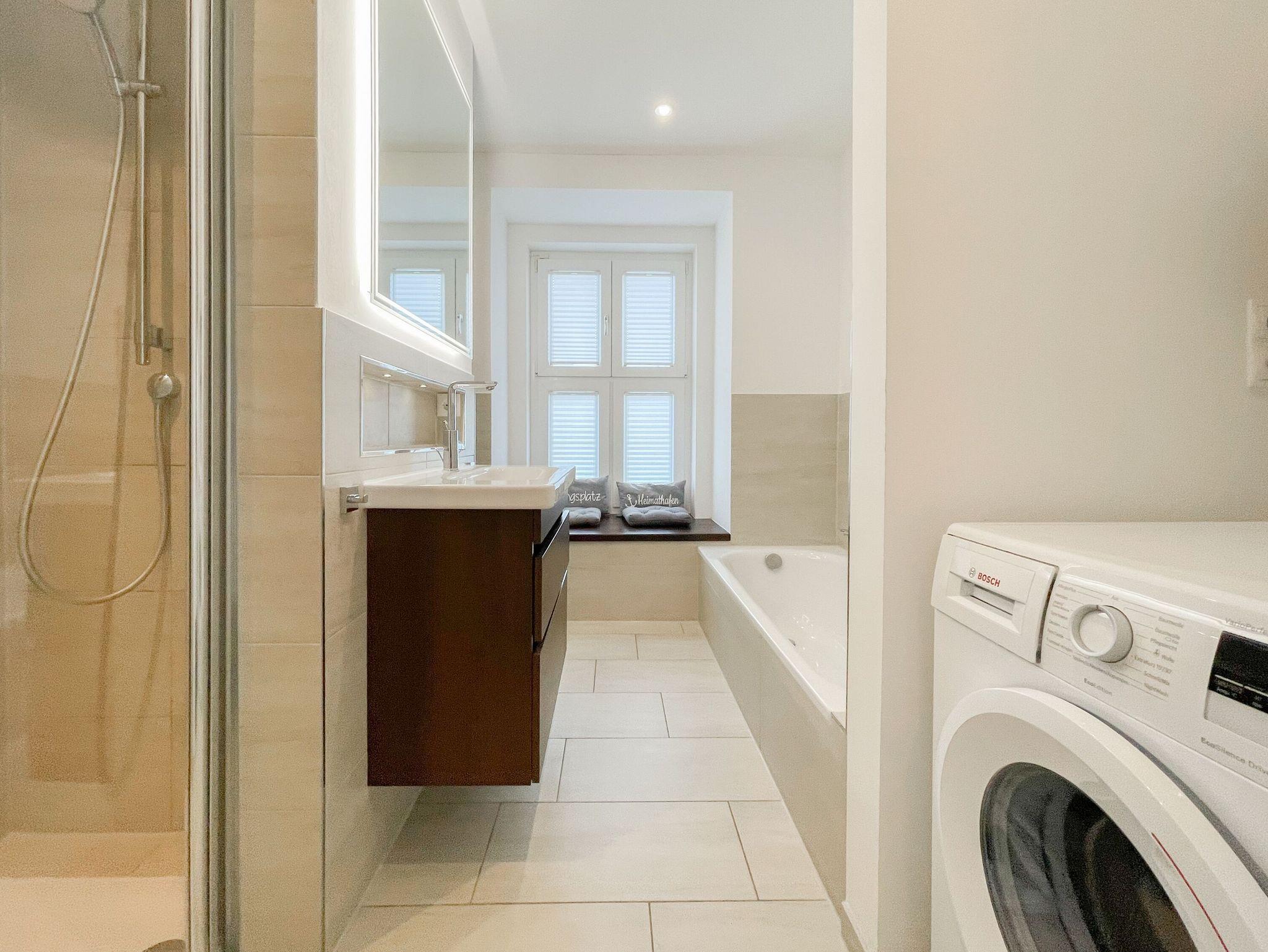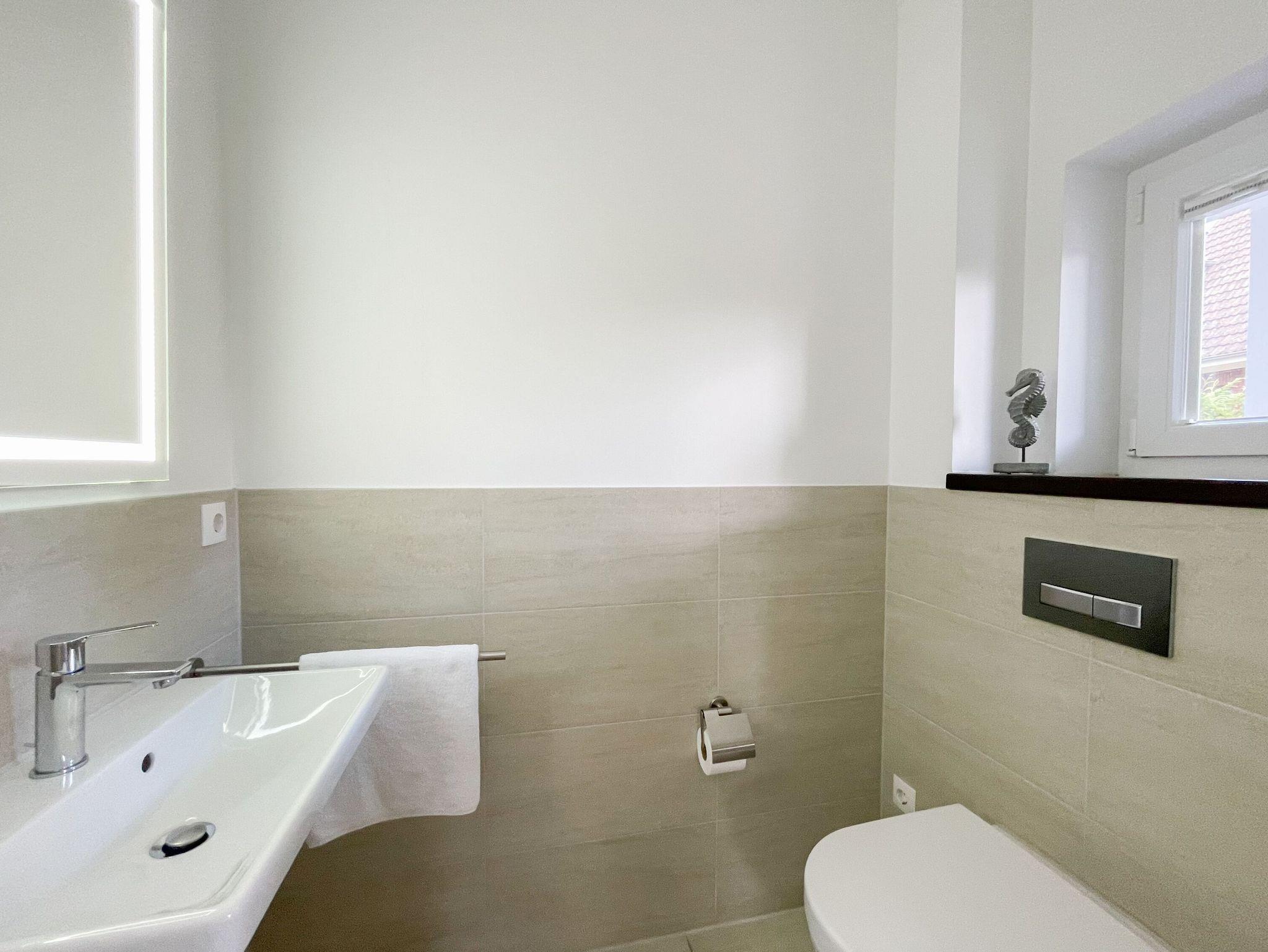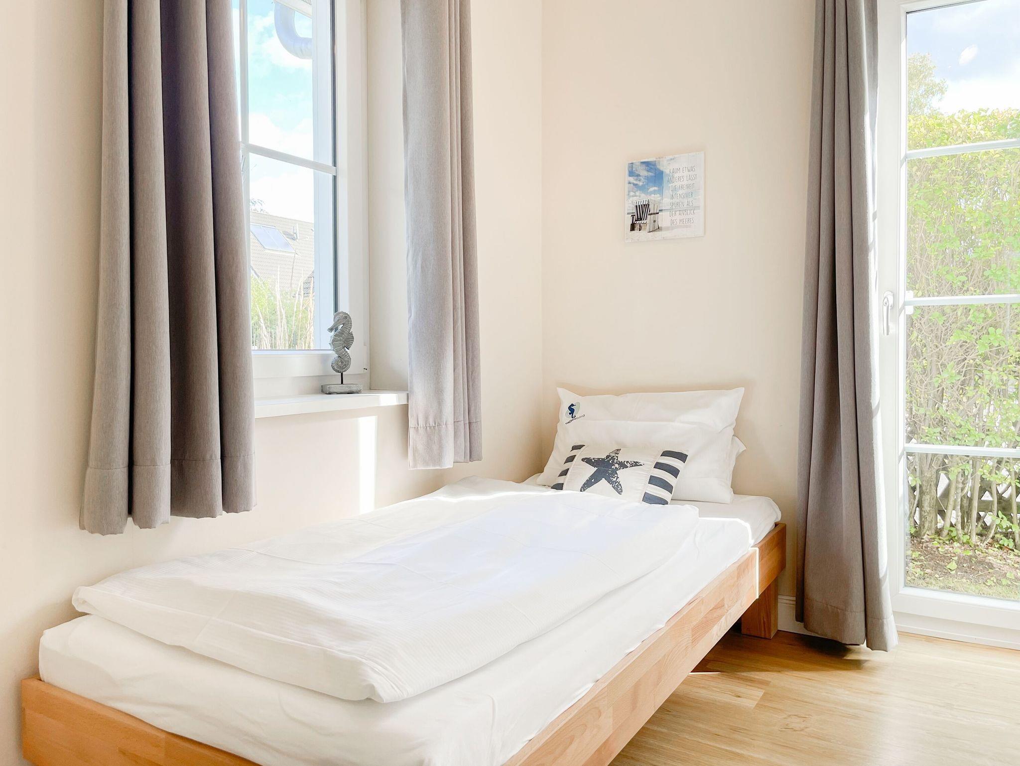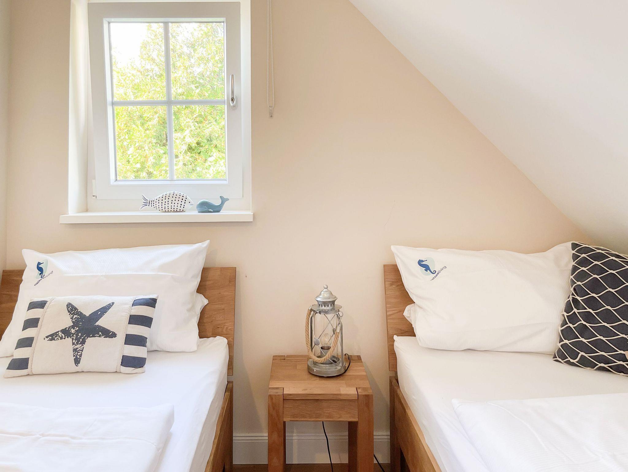 Es erwartet Sie ein wunderschönes Doppelhaus im Hampton Style. Sonnige Räumlichkeiten und die hochwertige Ausstattung sorgen für hohen Wohnstandard in einem schönen Ambiente. Mit 3 Schlafzimmern, einem modernen Bad mit Dusche und Badewanne sowie einem zusätzlichen Gäste WC, bietet das Haus auf[nbsp] 75 qm Wohnfläche ausreichend Raum für 5 Personen, um einen erholsamen Ostseeurlaub ganz nah am Strand zu verbringen. Im Erdgeschoss erwartet Sie ein gemütlich eingerichteter Wohnbereich mit Sofa, TV und Kaminofen, ein anschließender Essbereich sowie eine offene Einbauküche in bester Ausstattung zum gemeinsamen Kochen. Die vorgelagerte überdachte Veranda in Südausrichtung mit Garten ist ein herrlicher Platz zum Entspannen oder für Outdoor Aktivitäten. Ein Schlafzimmer, ausgestattet mit einem Einzelbett (90x200) und einer Kommode[nbsp] sowie ein Gäste WC, sind ebenfalls im Erdgeschoss untergebracht. Im Obergeschoss gibt es zwei separate Schlafzimmer, eines ist mit einem Doppelbett (180x200), einem Kleiderschrank und einem weiteren[nbsp] TV ausgestattet. Das andere ist mit 2 Einzelbetten (90x200), einem Kleiderschrank und einem Schreibtisch für das Homeoffice eingerichtet. Das hochwertige Bad mit Badewanne, Dusche und integrierter Waschmaschine, ist modern und lichtdurchflutet. Die Fenster der Schlafzimmer lassen sich abdunkeln (keine Blackout Verdunkelung). WLAN steht selbstverständlich zur Verfügung.