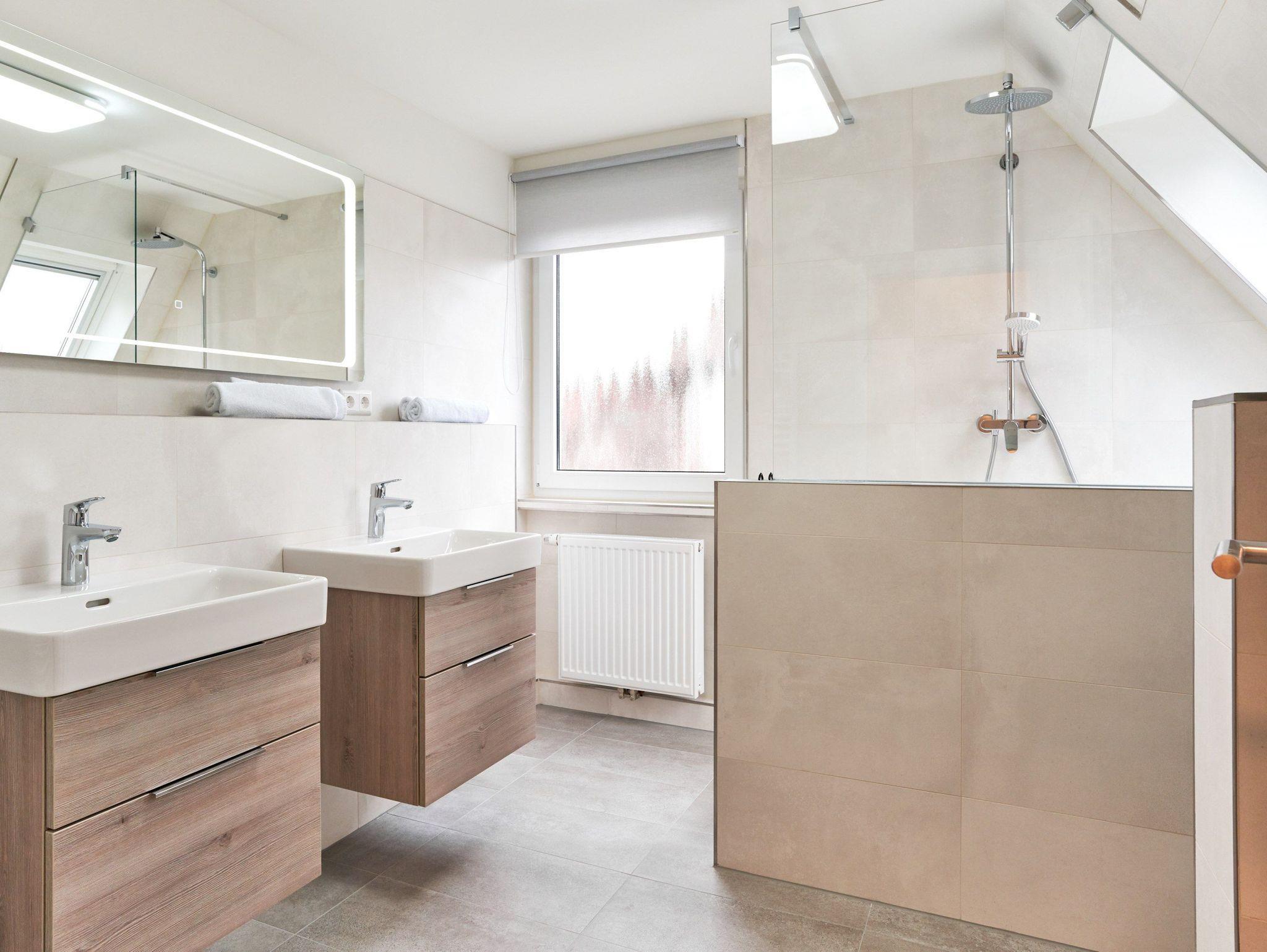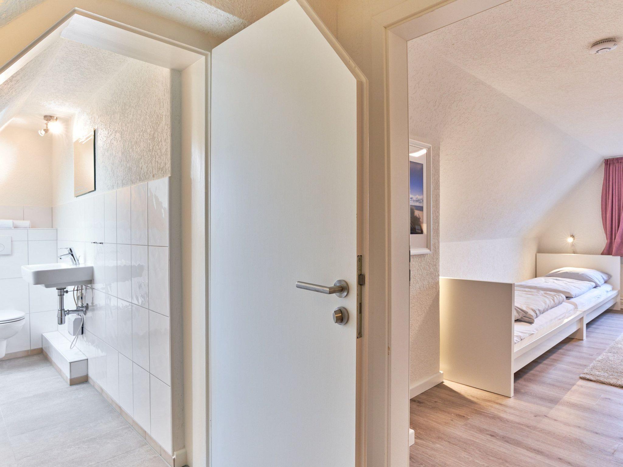Dieses in 2022 umfassend renovierte und großzügig geschnittene Apartment über zwei Ebenen teilt sich auf in Wohnbereich mit offener Küche, Badezimmer, Gäste-WC, 2 Schlafzimmer und möblierten Balkon. Im Wohnbereich finden Sie einen großen Essplatz, Sitzecke, Flachbildschirmfernseher und die angrenzende, komplett ausgestattete Küche mit Geschirrspüler und neuer Filter Kaffeemaschine. Im komplett neu gestalteten Badezimmer finden Sie eine begehbare Dusche, Lichtspiegel, neue Badobjekte, zwei Waschbecken mit Unterschränken sowie einen Badheizkörper für Handtücher. Das zusätzliche WC und die beiden Schlafräume finden Sie im oberen Bereich der Wohnung. Ein Schlafzimmer ist mit einem Doppelbett und extra Fernseher eingerichtet, das zweite Schlafzimmer bietet drei Einzelbetten und einen kleinen, begehbaren Kleiderschrank. Verdunkelungsgardinen sorgen in Wohn- und Schlafzimmern für eine gemütliche Atmosphäre und ungestörten Schlaf.