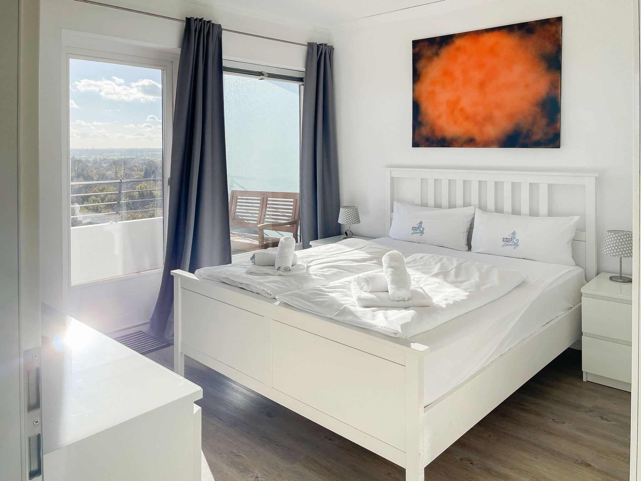 Die großzügige Eckwohnung bietet[nbsp] mit 2 Schlafzimmern und 2 Bädern auf 120 qm höchsten Wohnkomfort für 4 Personen, um einen entspannten Urlaub zu verleben. Der umlaufende Sonnenbalkon ist sowohl vom Wohnbereich als auch von den [nbsp]beiden Schlafzimmern zugänglich. Genießen Sie tagsüber das sensationelle Meerblickpanorama aus nahezu jedem Raum und bei Dunkelheit die besondere Atmosphäre der beleuchteten Lübecker Bucht. Es steht ein großzügiges[nbsp] Wohnzimmer mit anschließendem Essbereich für 4 Personen zur Verfügung. In der offenen, bestens ausgestatteten Designküche mit Induktionskochfeld, Mikrowelle und Spülmaschine, ist ebenfalls eine Waschmaschine untergebracht. Die beiden Schlafzimmer sind jeweils mit einem Doppelbett (180x200 und 160x200) und TV ausgestattet. Die Fenster sind mit Verdunkelungsvorhängen versehen. Zwei neue, hochwertige Bäder, eines mit Dusche und eines mit Badewanne, runden das Angebot ab. Ein fester PKW Stellplatz in der Hotelgarage (Einfahrtshöhe 1,90/kein Aufzug) ist[nbsp] inklusive. Bei Verlust der Parkkarte ist Ersatz zu leisten.