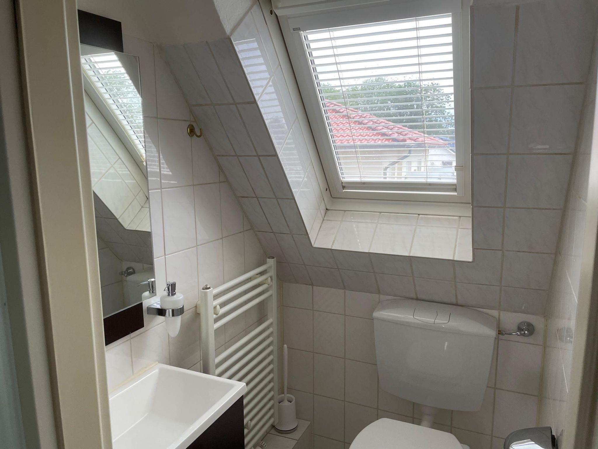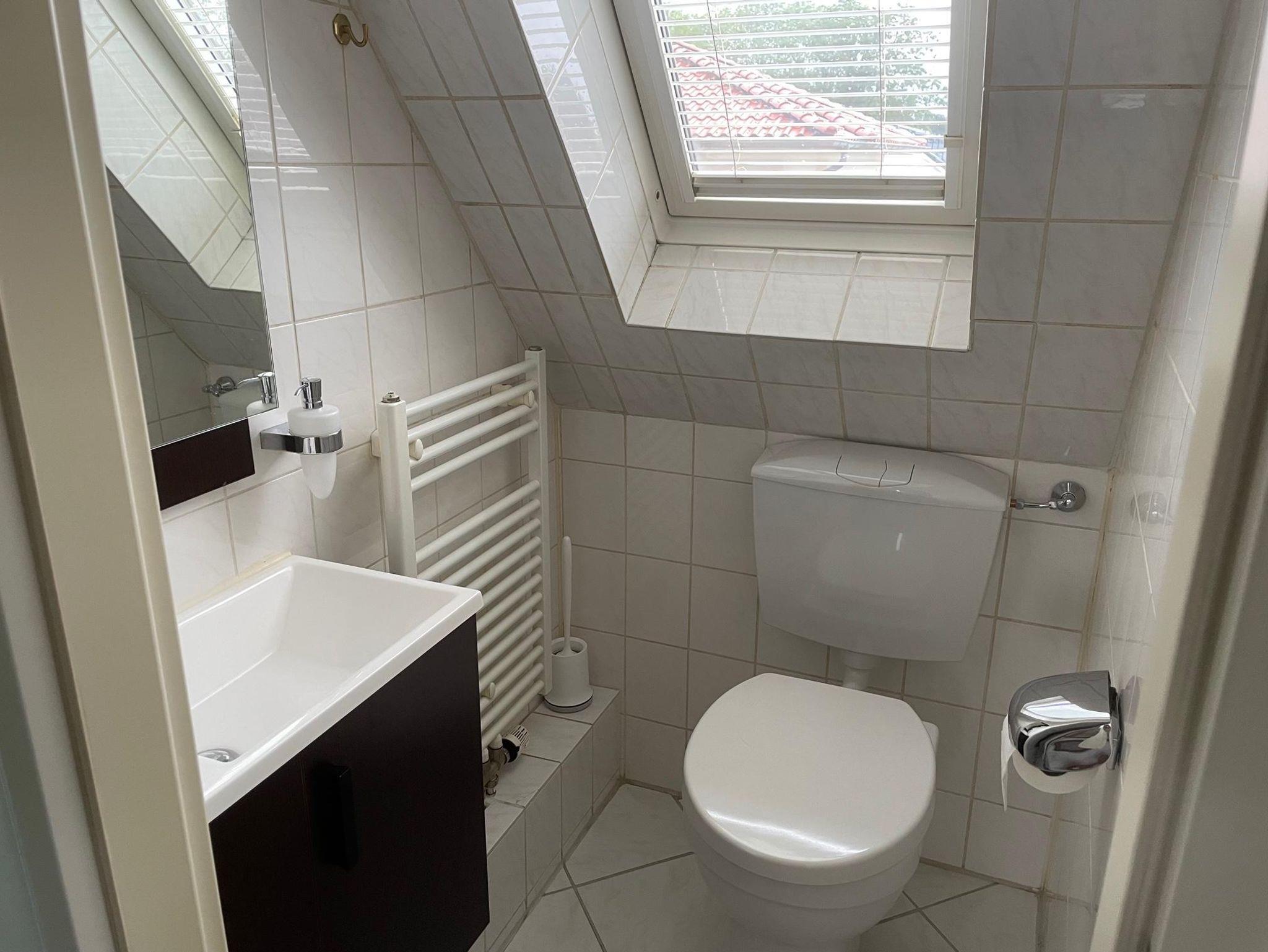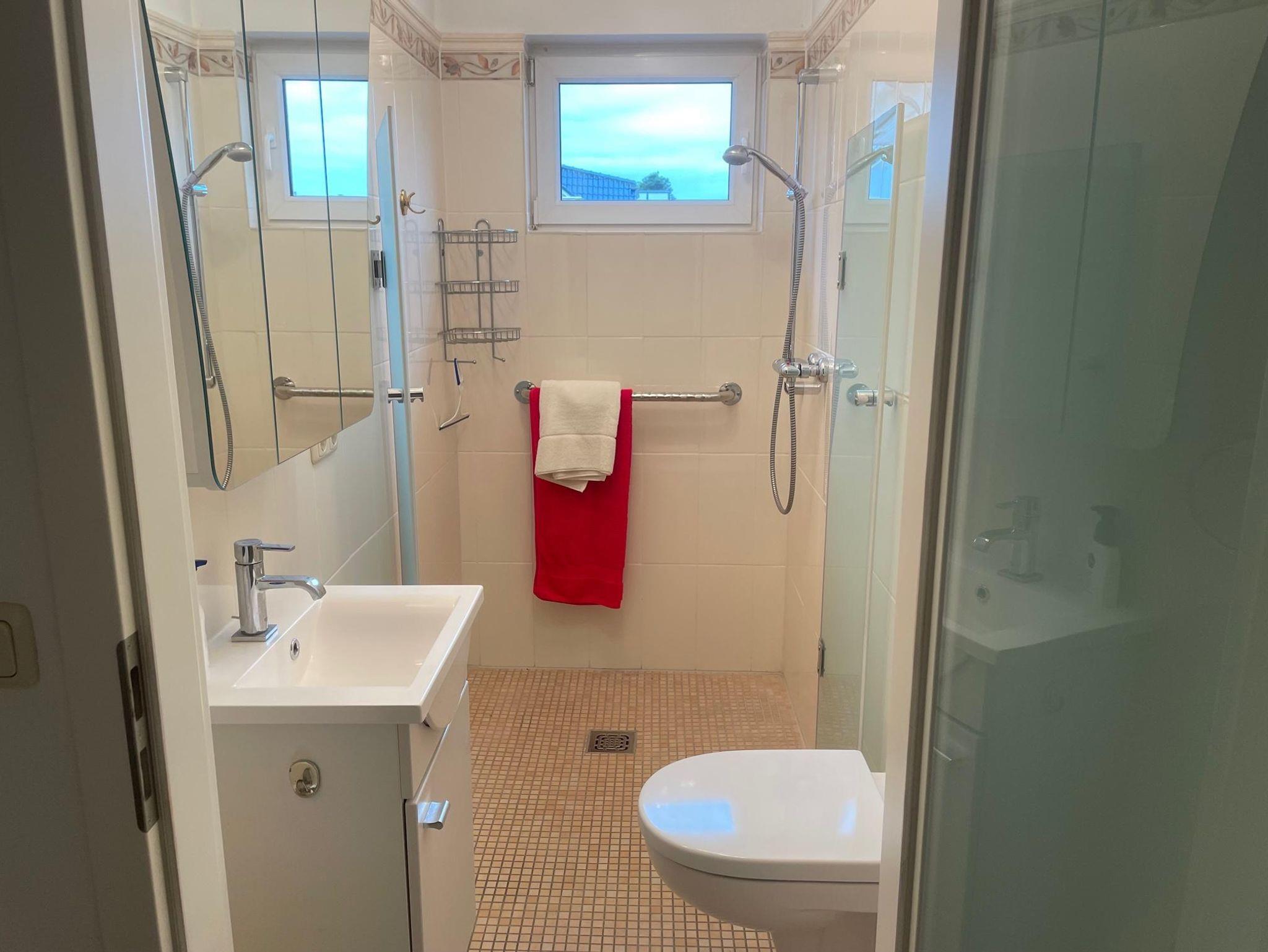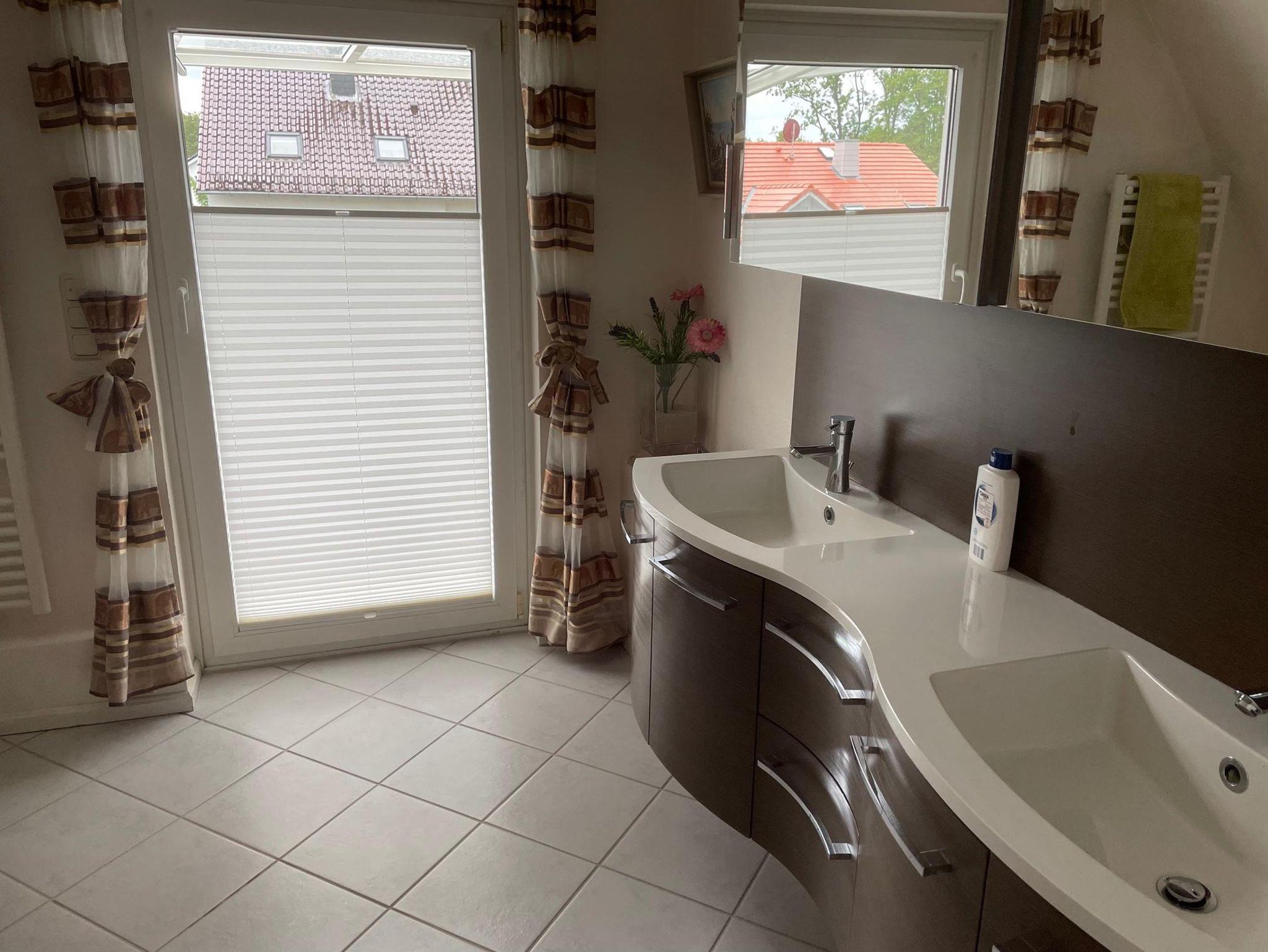 In der oberen Etage befinden sich die beiden Schlafräume sowie ein Gäste-WC und ein weiteres Badezimmer mit einem Doppelwaschbecken.