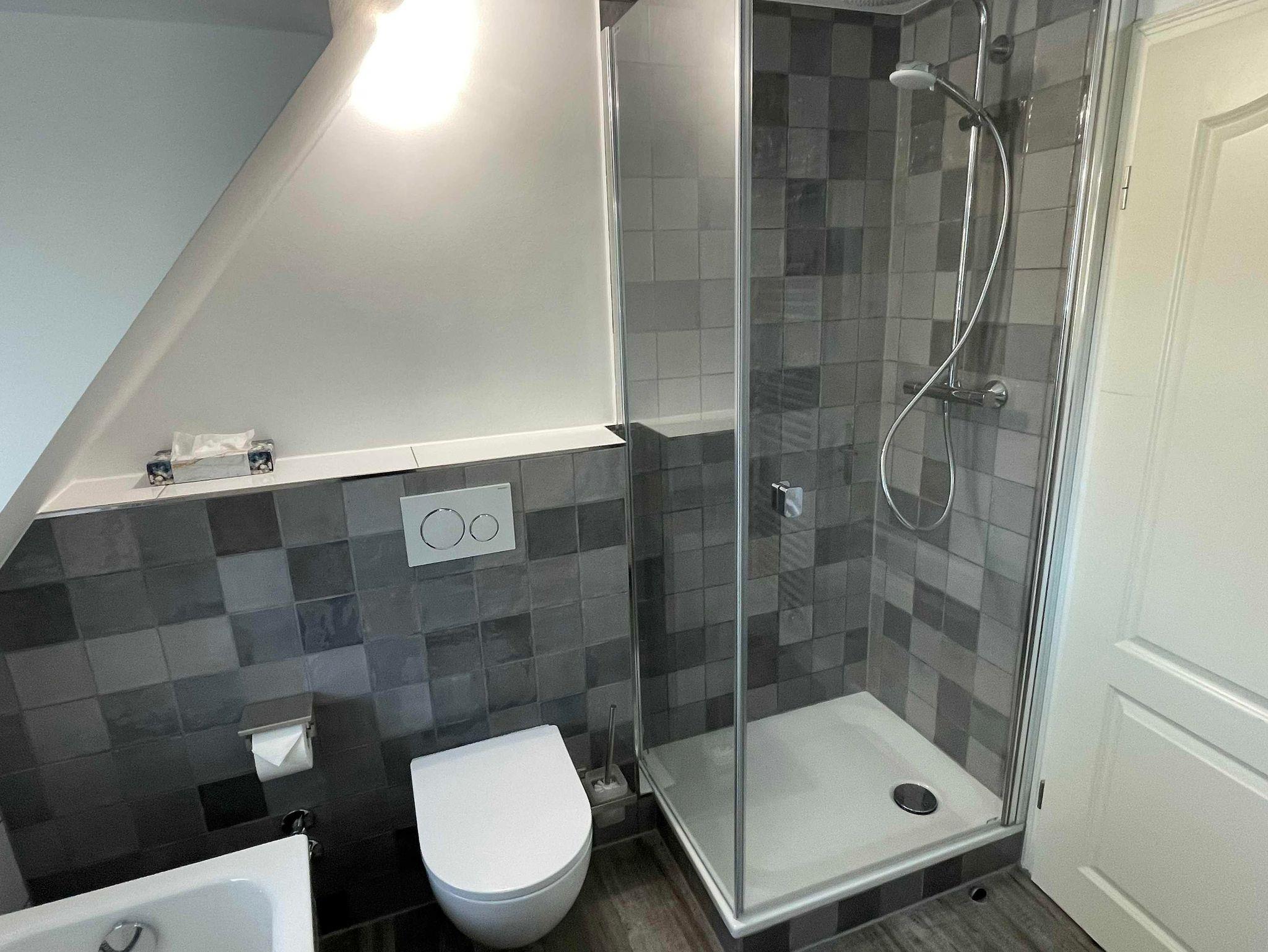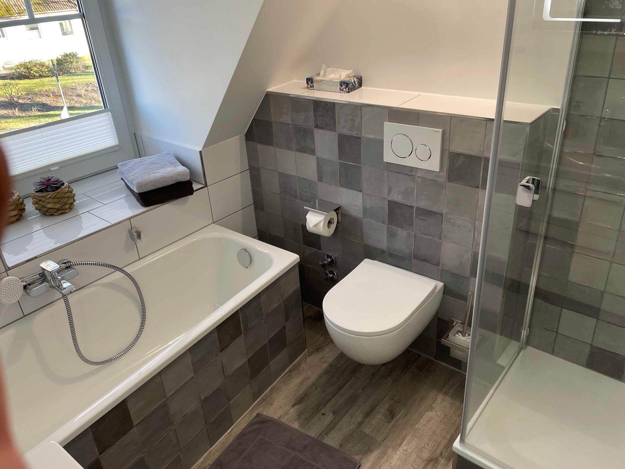 Im Vollbad steht eine Badewanne und eine Dusche, ein WC, ein Handtuchheizkörper und ein Waschtisch mit Schubladen. Ein Fön ist vorhanden.