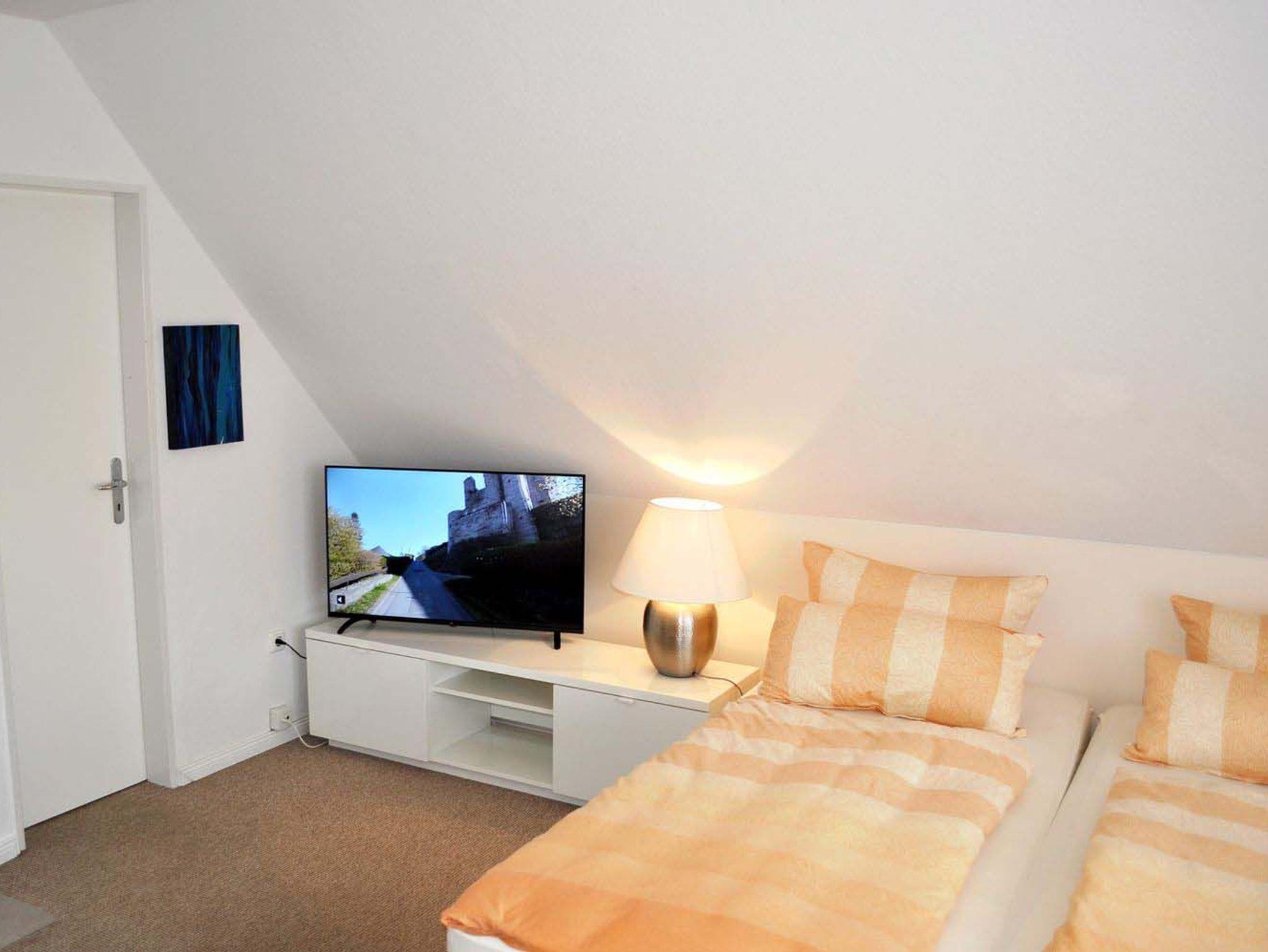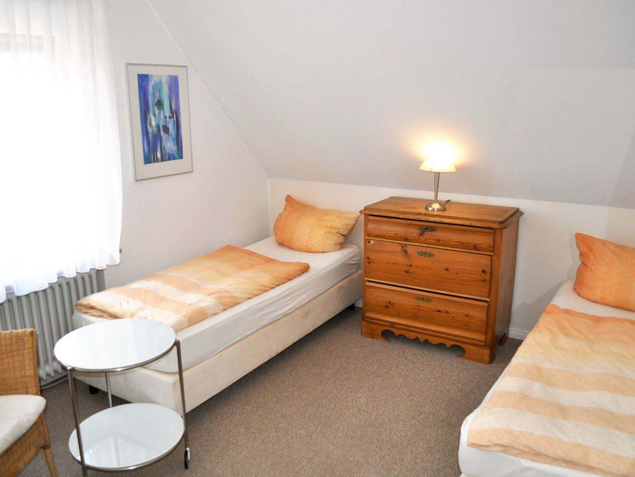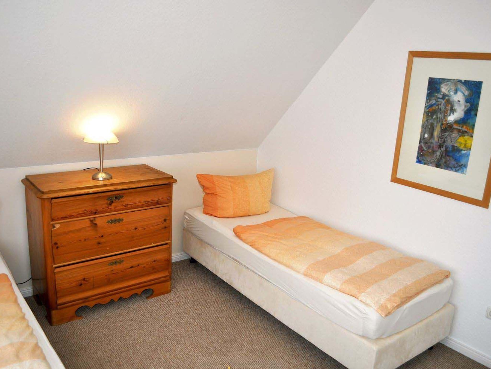 Schlafzimmer 1: 2 Kommoden, 2 Tischlampen, Einzelbett 2,00 x 0,80 m, elektrische Aussenrollladen, Flachbildschirm, Garderobe, Korbsessel, Sat-TV, Spiegel, Tisch