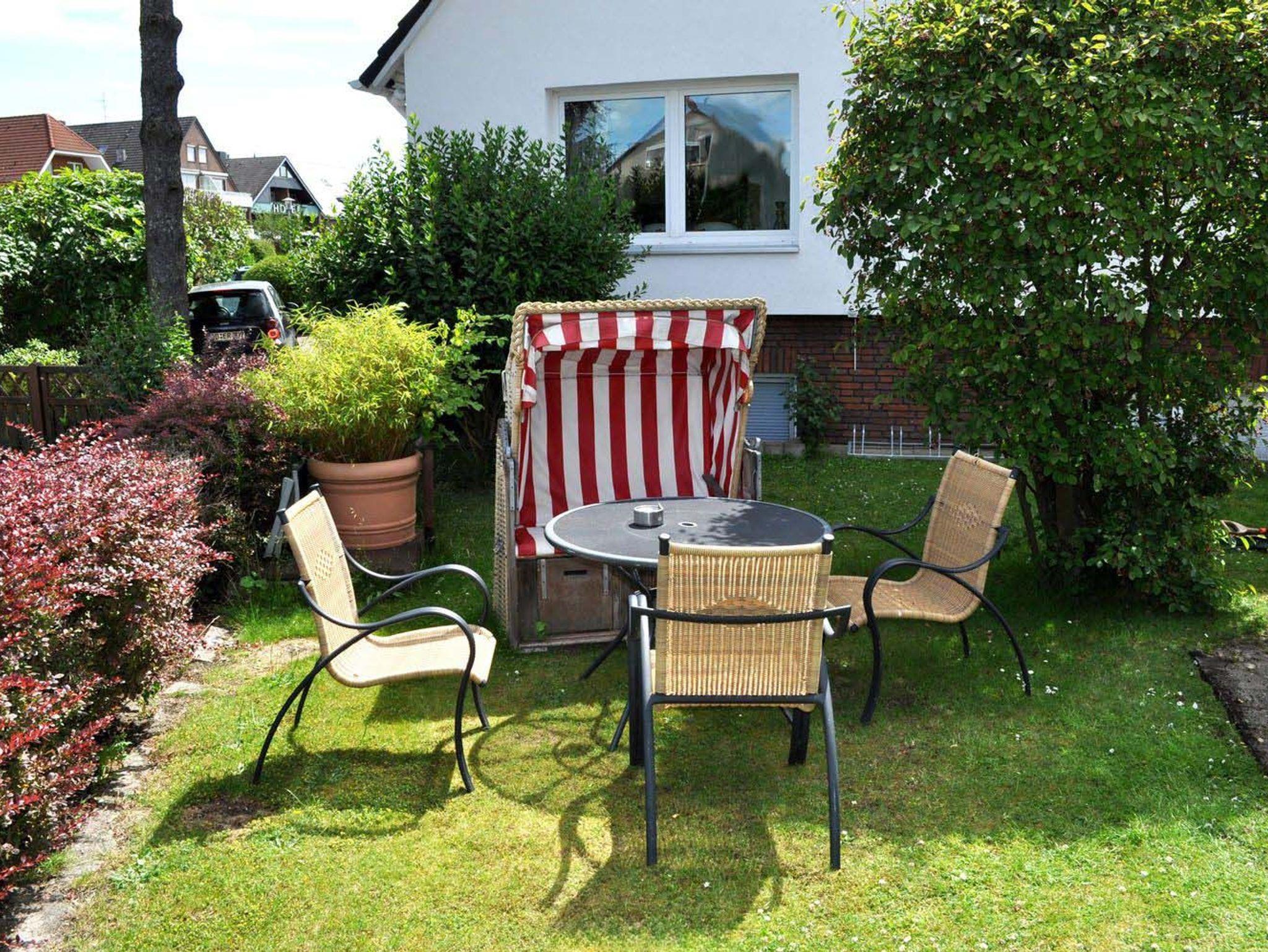 Terrasse: Für die Gemeinschaft auf dem Grundstück mit Tisch und Stühlen, Strandkorb