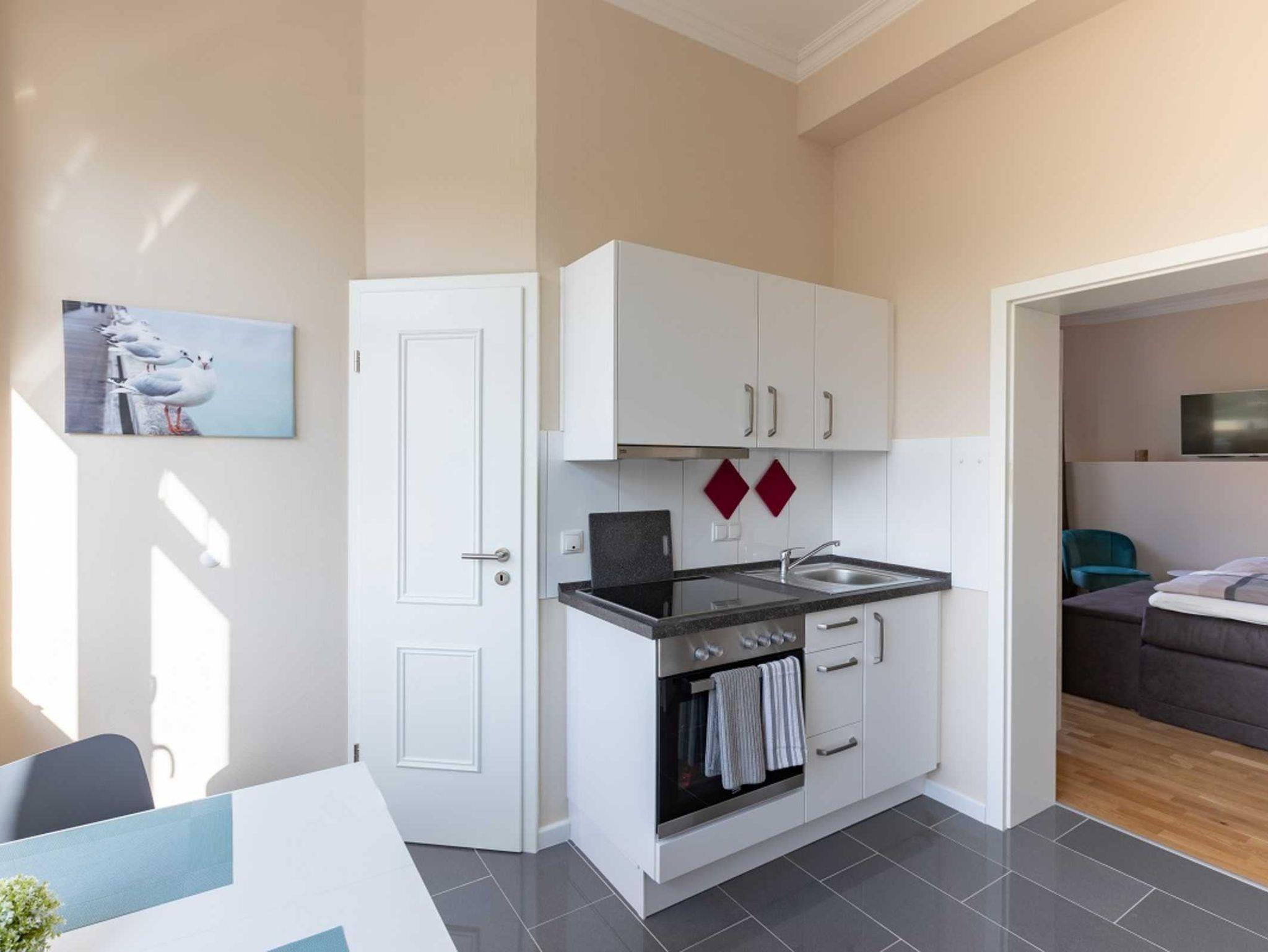 Das ca. 32 qm große Apartment Silbermöwe befindet sich im 1. Obergeschoss. Die Küche ist voll ausgestattet und im Bad liegt der Fön bereit – natürlich mit direktem Zugang zum Balkon.