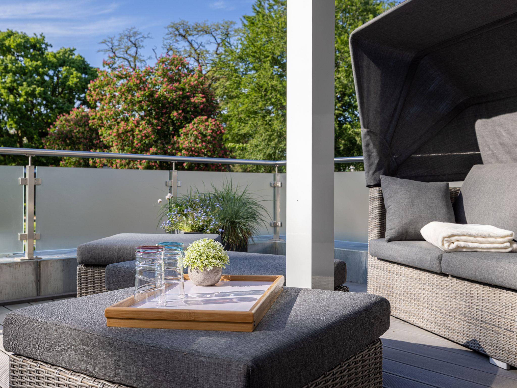 Unsere Super-Suite Wellenkamm im Erdgeschoss mit zwei separaten Zimmern, Flur, Küche und Bad – natürlich mit direktem Zugang zu der großzügigen und gemütlich möblierten Terasse.