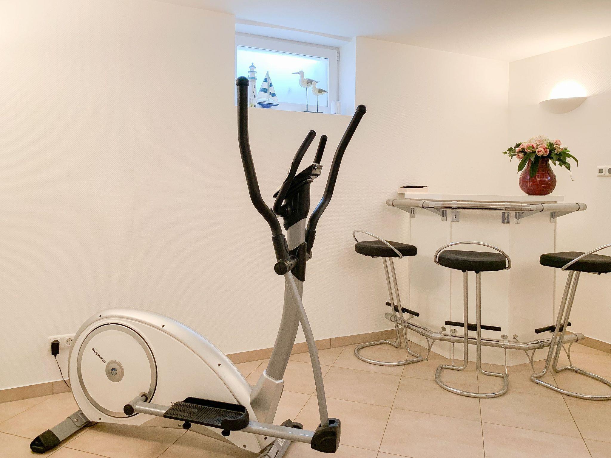 Ein sehr schöner Wellnessbereich mit Sauna (Nutzung gegen[nbsp] Gebühr), Tauchbecken, Dusche und Ruheraum sowie[nbsp] Crosstrainer und[nbsp] Kicker stehen den Gästen des Hauses zur gemeinschaftlichen Nutzung zur Verfügung. Ebenso eine Waschmaschine und ein Trockner (Münzgeräte).