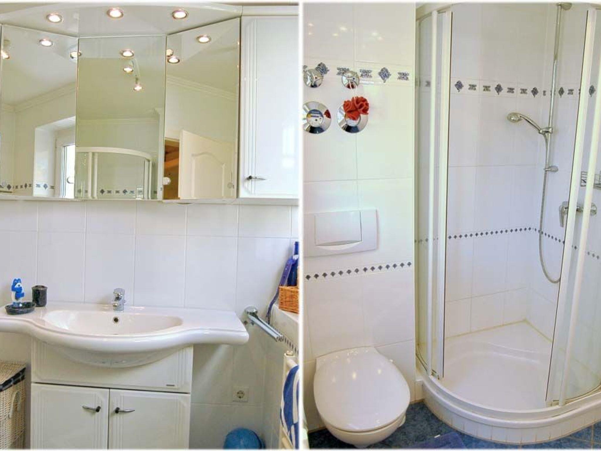 Bad 1: 2 Föne, Dusche, Duschkabine, elektrische Aussenrollladen, Kosmetikspiegel, Lockenstab, Spiegelschrank, Wäschekorb, Waschtisch, WC