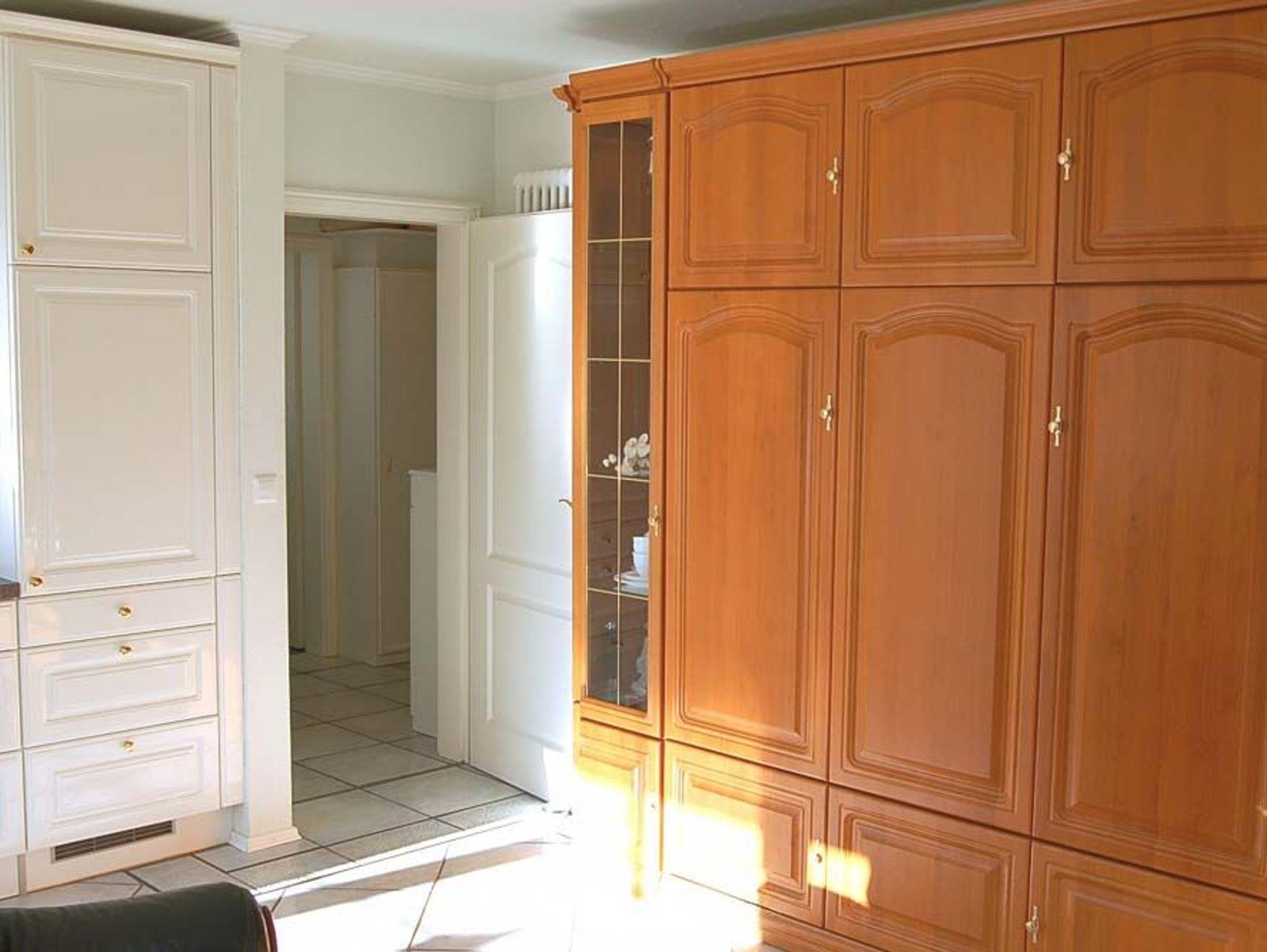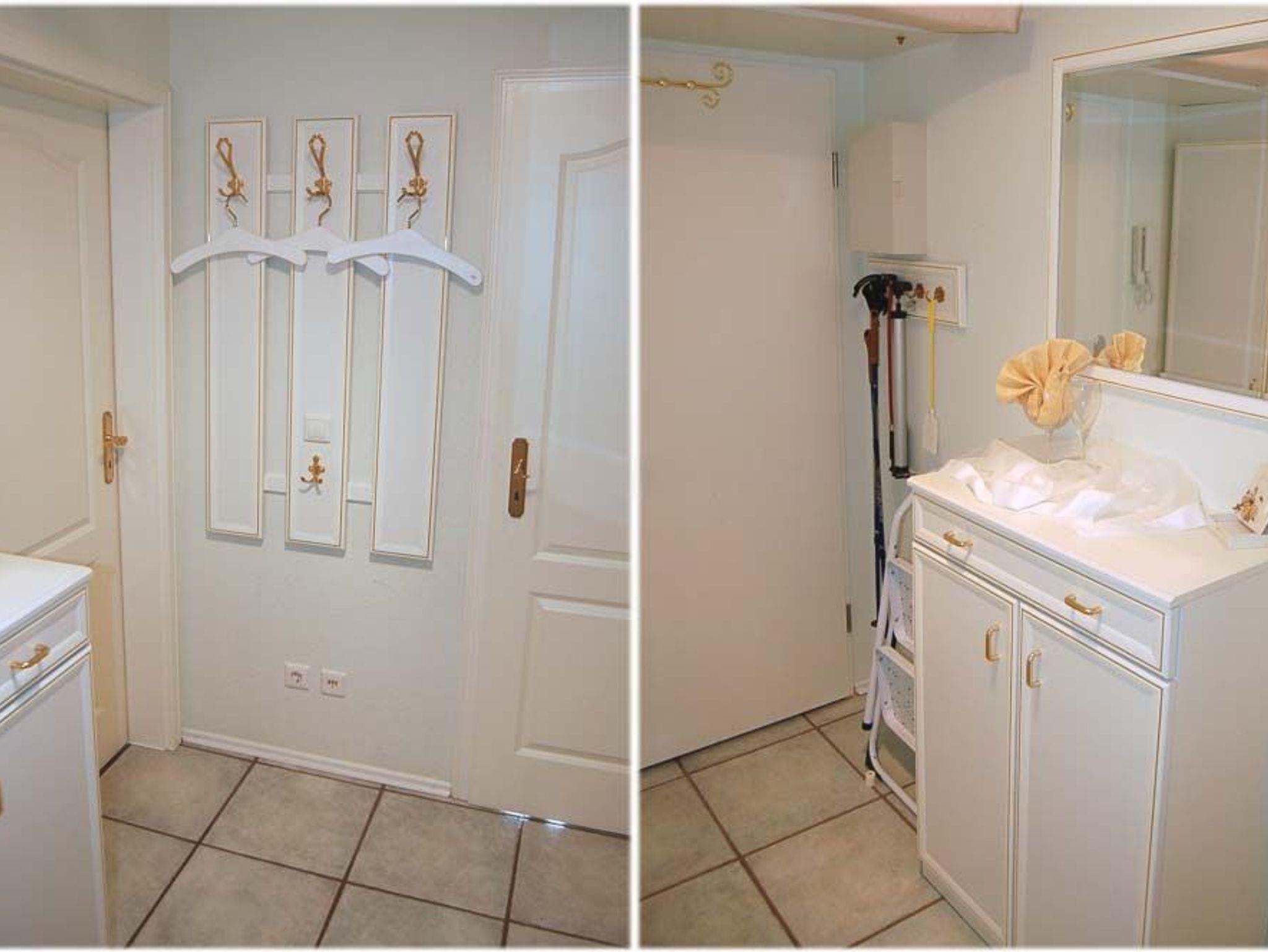 Flur: Einbauschrank, Garderobe, Kommode, Schlüsselbrett, Spiegel, Staubsauger, Trittleiter