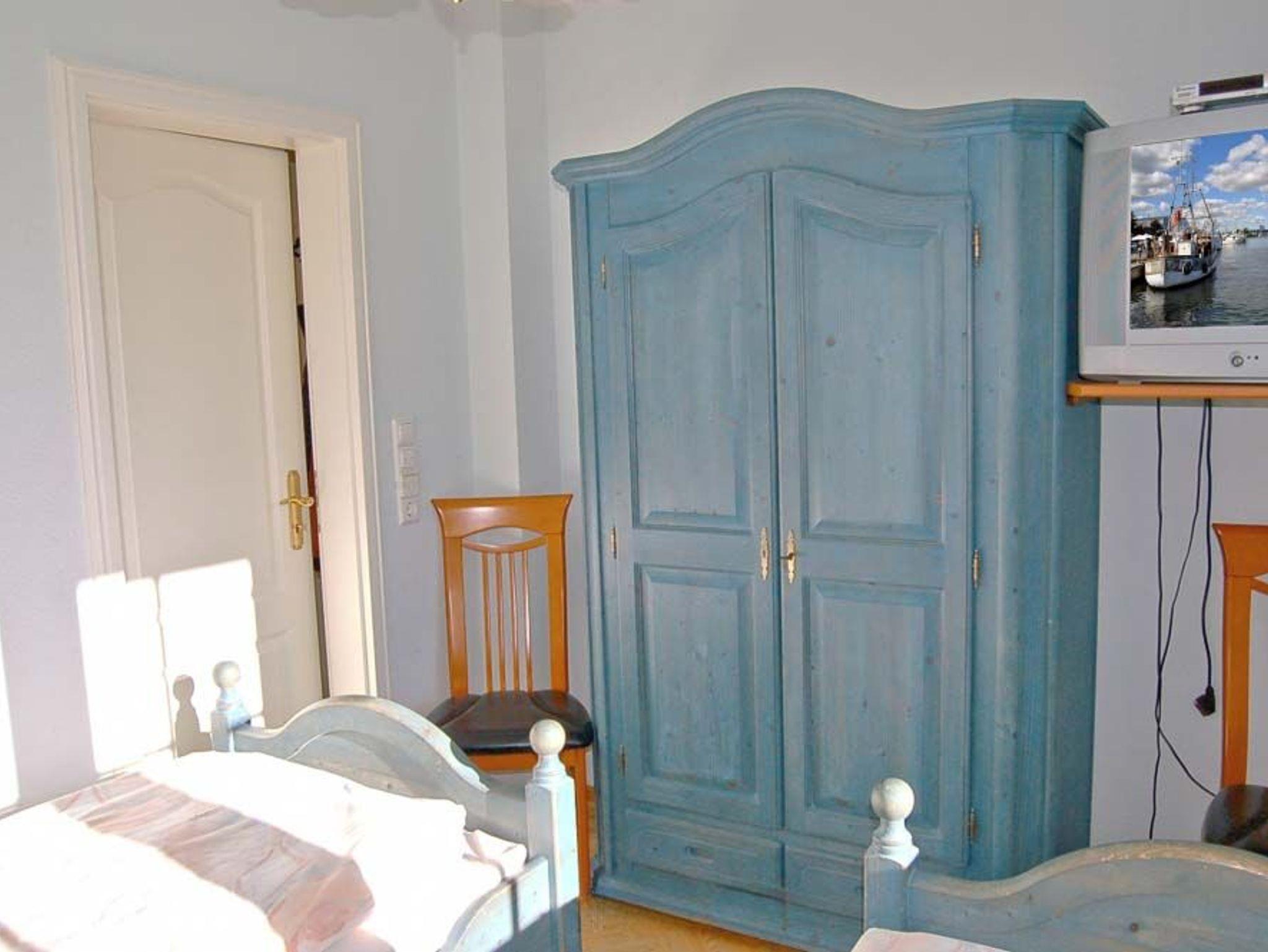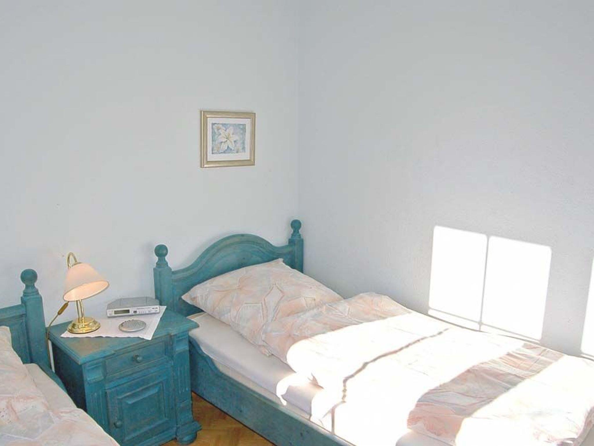 Schlafzimmer 1: 2 Einzelbetten, 2 Stühle, DVD-Player, elektrische Aussenrollladen, Kabel-TV, Kleiderschrank, Nachttisch, Radiowecker