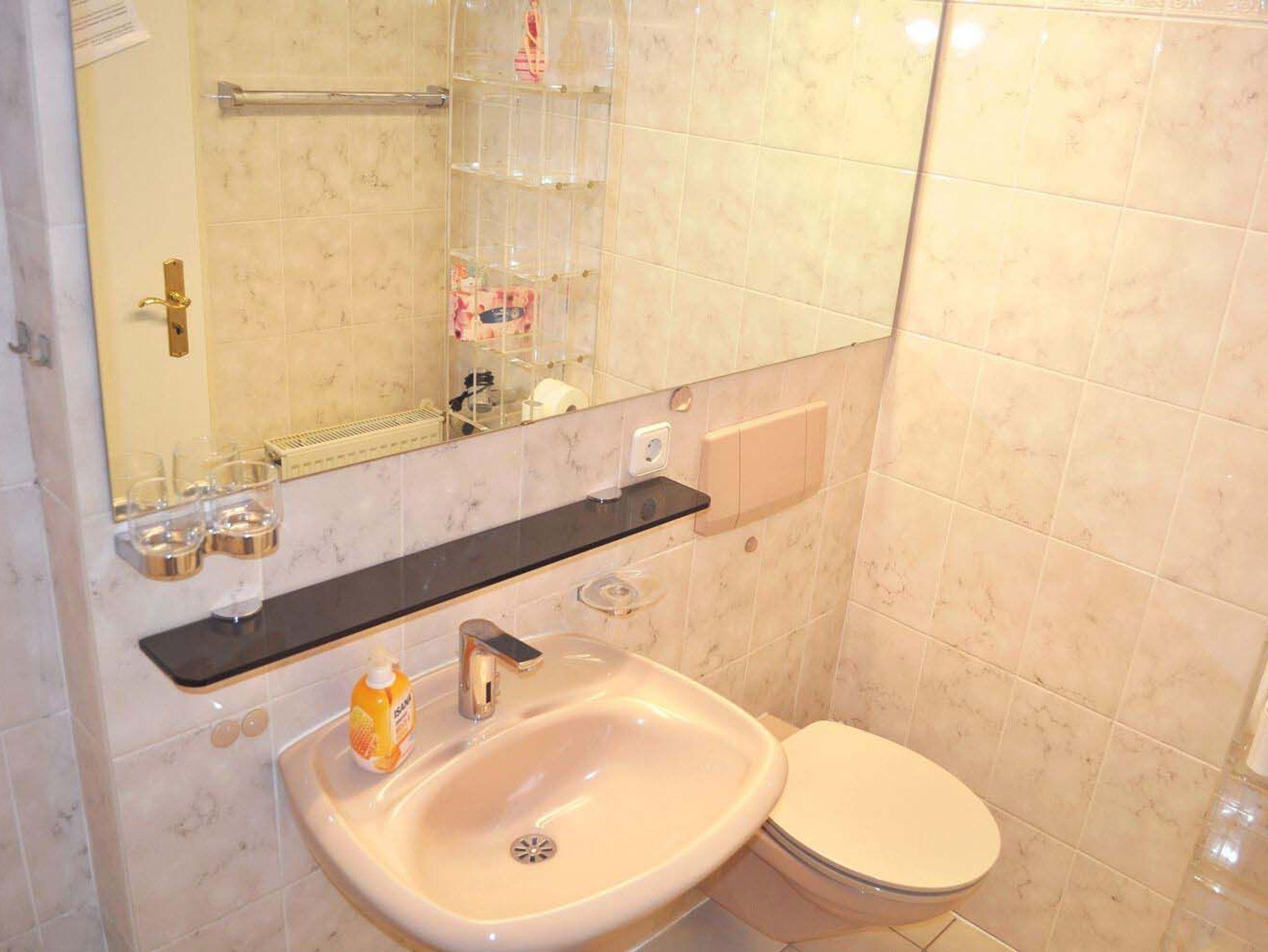 Bad 1: Badewanne, Fön, Regal, Spiegel, Waschbecken, WC