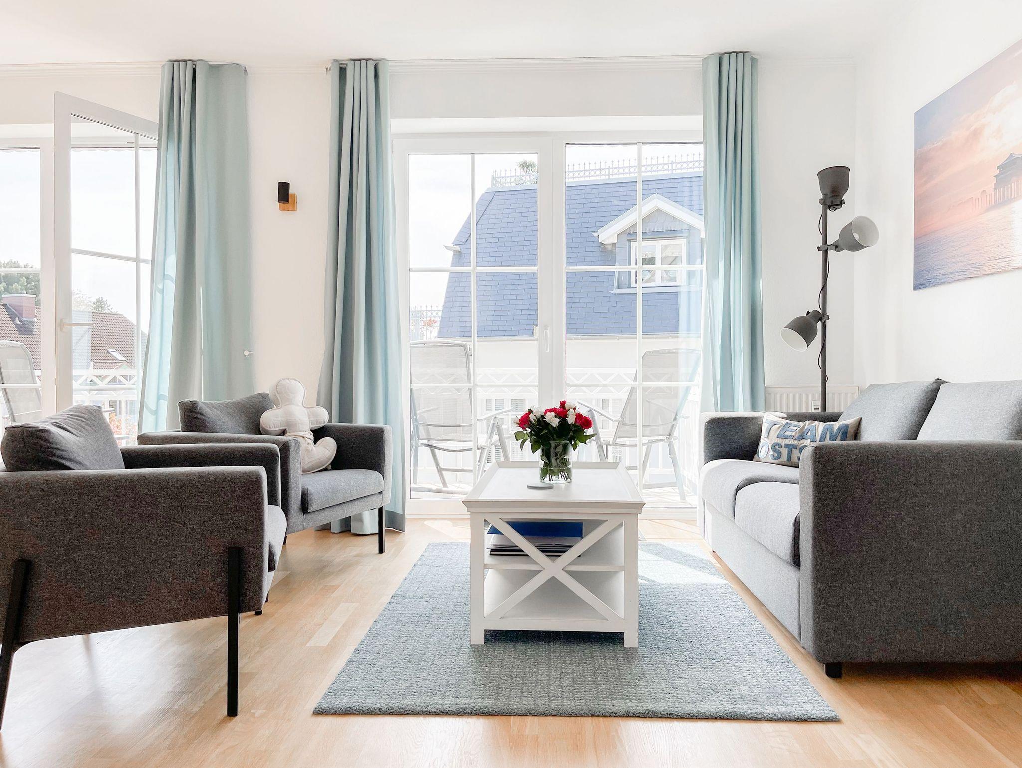 Die Ferienwohnung Ankerplatz[nbsp] liegt[nbsp] in der 2. Etage im Haus Sonnenpark und erstreckt sich über 2 Wohnebenen bis ins Dachgeschoss. Ein herrlicher Sonnenbalkon, ausgestattet mit Gartenmöbeln und einer elektrischen Markise, verläuft über den[nbsp] gesamten Wohnbereich und bietet einen tollen Rückzugsort bis zum letzten Sonnenstrahl. Die frisch renovierte Wohnung verfügt über ein gelungenes Raumkonzept mit neuer Küche, neuem Duschbad und Gäste WC. Die Ausstattung ist hochwertig und bietet 4 Personen ausreichend Raum zum Wohlfühlen in Strandnähe. Es erwartet Sie ein heller, großzügiger Wohnraum mit bodentiefen Fensterflächen, geschmackvoll gestaltet und mit einem komfortablen Sofa und zwei Sesseln eingerichtet, TV, Hifi-Anlage und ein Essbereich mit ausreichend Platz für 4 Personen. WLAN steht selbstverständlich zur kostenlosen Nutzung zur Verfügung. Die integrierte Küche ist bestens ausgestattet, unter anderem mit Spülmaschine, Backofen, Nespressomaschine und vielem mehr. Im Eingangsbereich befindet sich eine Garderobe und ein separates Gäste WC. Auf der oberen Ebene, die über eine Treppe vom Wohnbereich zu erreichen ist, bietet die Wohnung zwei separate Schlafzimmer mit Doppelbetten (180x200), Kleiderschränken und Verdunkelungsvorhängen sowie ein äußerst großzügiges, modernes Duschbad mit einem Doppelwaschtisch und viel Tageslicht. Schlafzimmer 1 verfügt zusätzlich über einen TV und Schlafzimmer 2 über einen Schreibtisch und das Bett besteht aus 2 Einzelbetten, die beliebig zusammengeschoben oder getrennt genutzt werden können.