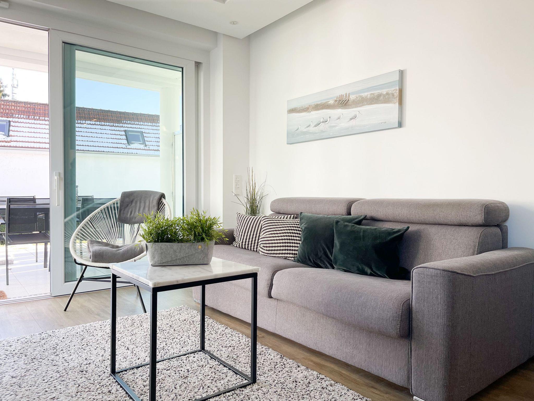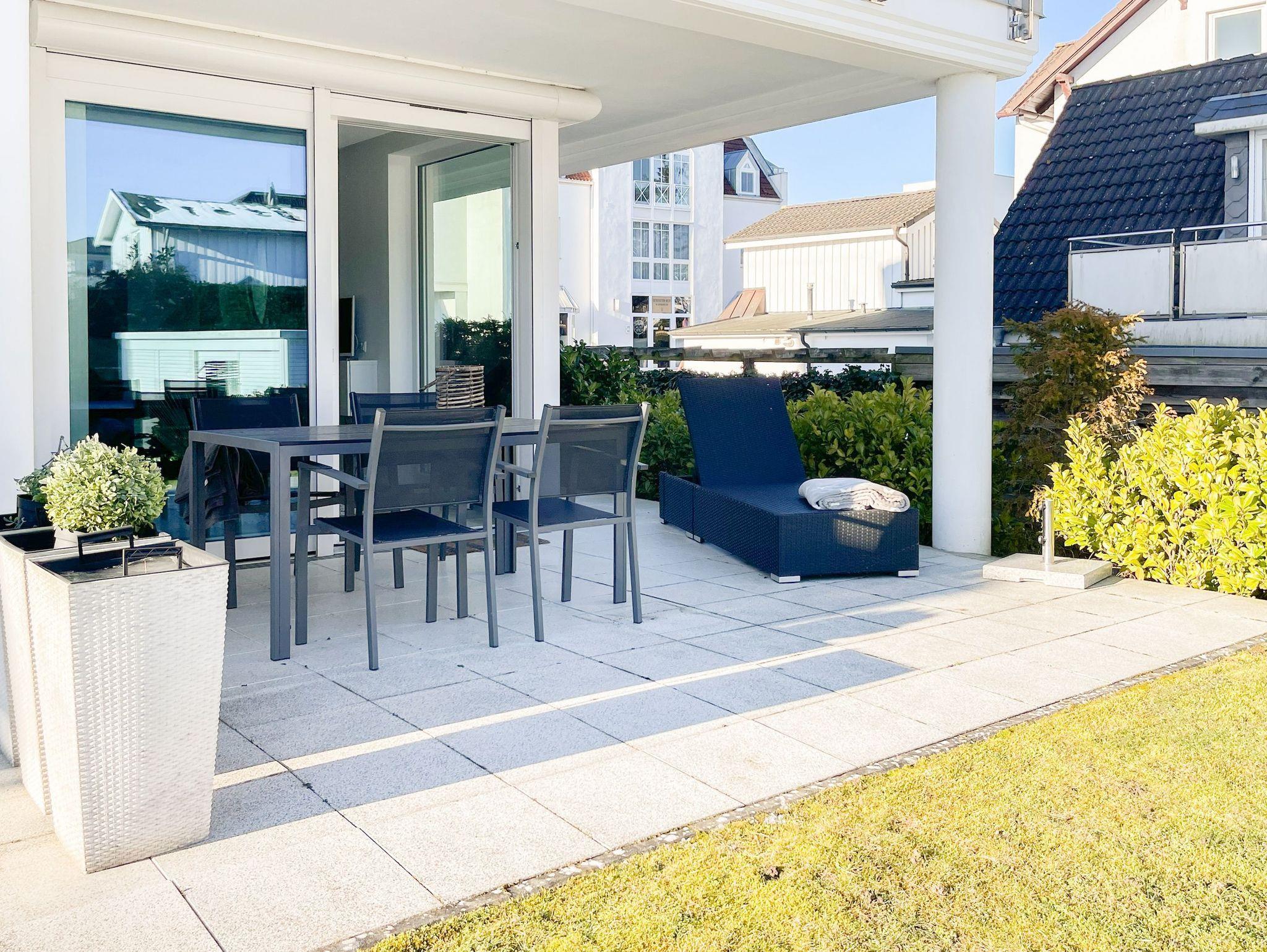 Bodentiefe Fensterelemente in der gesamten Eckwohnung, alle mit elektrischen Außenjalousien versehen, sorgen für lichtdurchflutete Räumlichkeiten. Hochwertige Bodenbeläge, die moderne, bestens ausgestattete Einbauküche und die geschmackvolle Einrichtung schaffen ein zeitgemäßes, schönes Wohnambiente. Die teilweise überdachte Sonnenterrasse ist großzügig um den gesamten Wohnbereich herum angelegt. Ausgestattet mit Gartenmöbeln und Sonnenliege ein idealer Rückzugsort zu jeder Tageszeit. Der Wohnbereich mit Terrassenzugang ist mit einem Schlafsofa (160x200), TV und WLAN ausgestattet, der integrierte Essbereich ist für 4 Personen ausgelegt. Das Schlafzimmer verfügt über ein Boxspringbett (180x200) und TV. Das hochwertige, helle Bad ist großzügig angelegt.