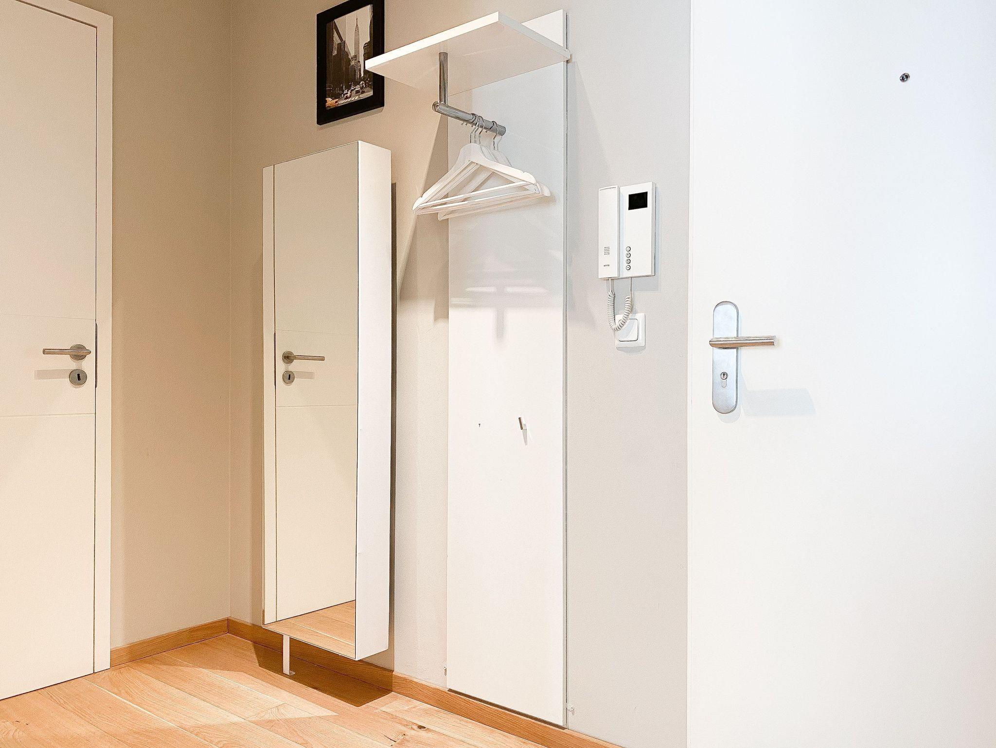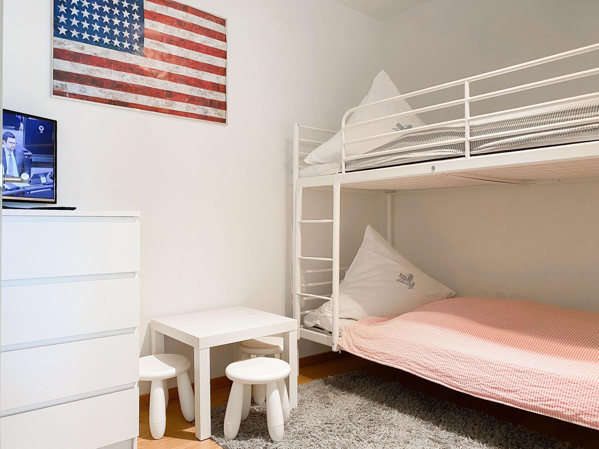 Die Wohnung ist komplett mit Echtholzparkett und Fußbodenheizung ausgestattet. Sie verfügt über einen hellen, freundlichen Wohnraum mit gemütlicher Sitzecke, TV, Radio und WLAN sowie einer offenen, gut ausgestatteten Küche mit angrenzendem Essbereich. Ein Schlafzimmer mit Doppelbett sowie ein weiteres, kleines, innenliegendes Schlafzimmer mit Etagenbett stehen zur Verfügung. Das Bad ist modern und luxuriös. Die 30 qm große Terrasse ist zum Süden ausgerichtet und mit gemütlichen Lounge Möbeln und Essbereich ausgestattet und verfügt über eine elektrische Markise. Sämtliche Fenster sind bodentief und mit elektrischen Außenjalousien versehen. Ein PKW Stellplatz befindet sich in der hauseigenen Tiefgarage.