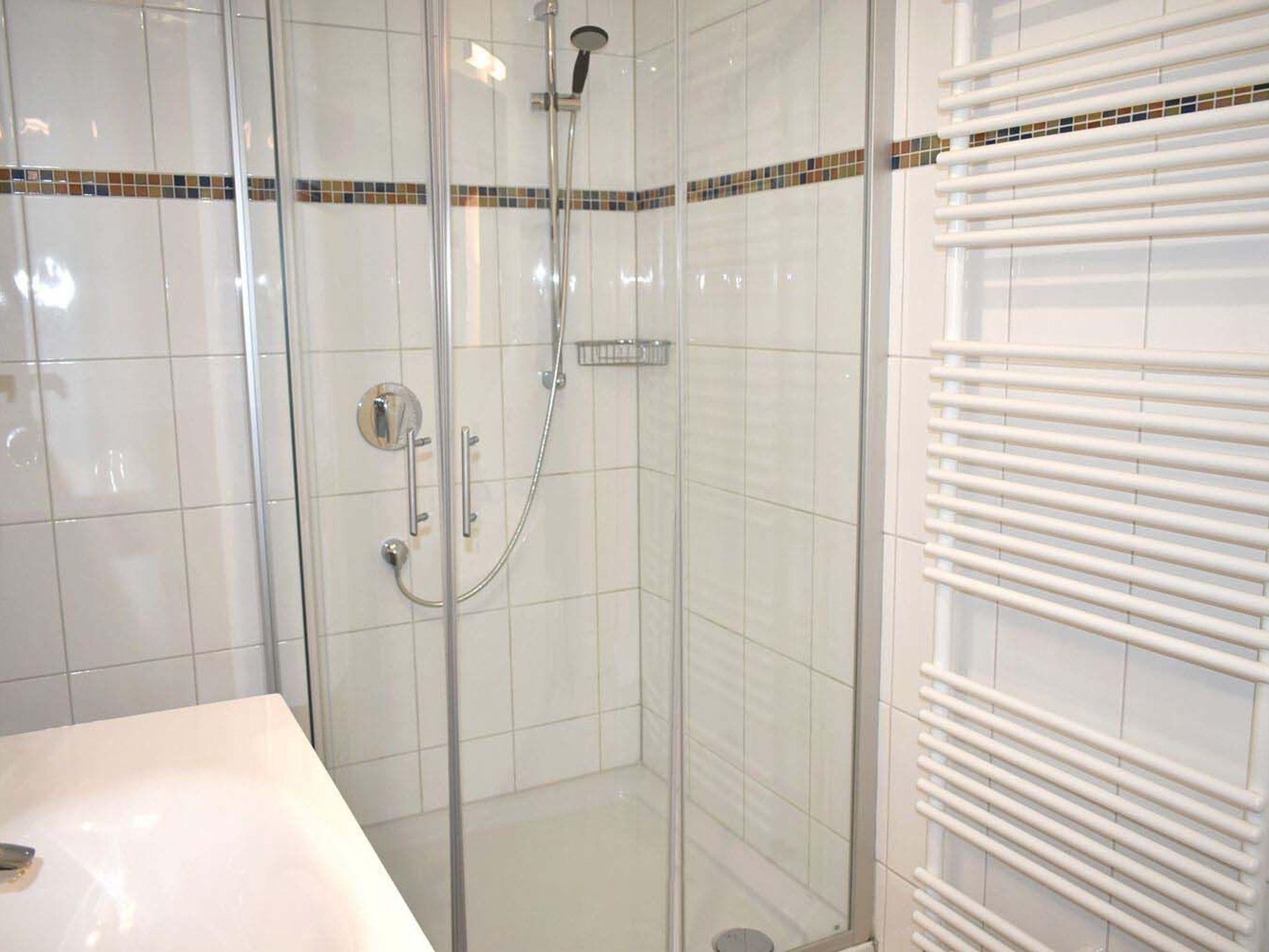 Bad 1: Dusche, Duschkabine, Fön, Hocker, Regal, Spiegelschrank, Waschtisch, WC