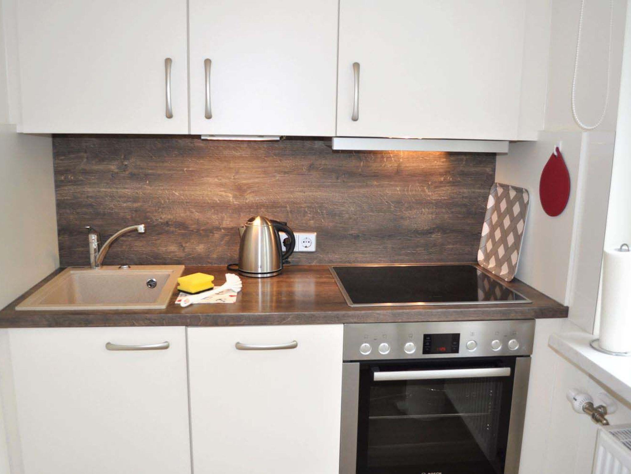 Küche: 4 Plattenherd mit Ceranfeld und Backofen, Dunstabzugshaube, Kaffeemaschine, Kochtöpfe, Küchenzeile, Kühlschrank mit 3* Gefrierfach, Spülmaschine, Toaster, Töpfe, Wasserkocher